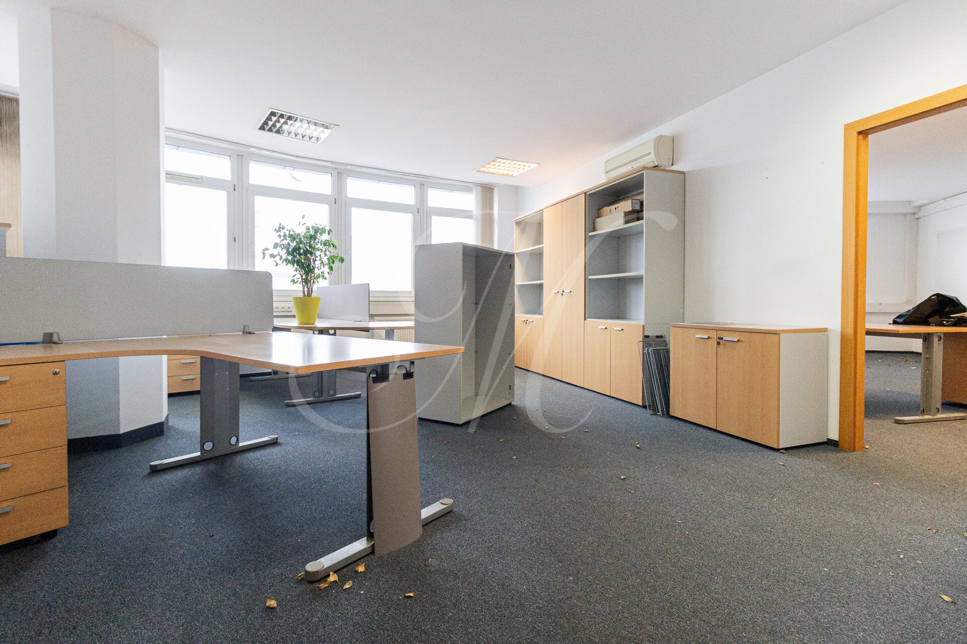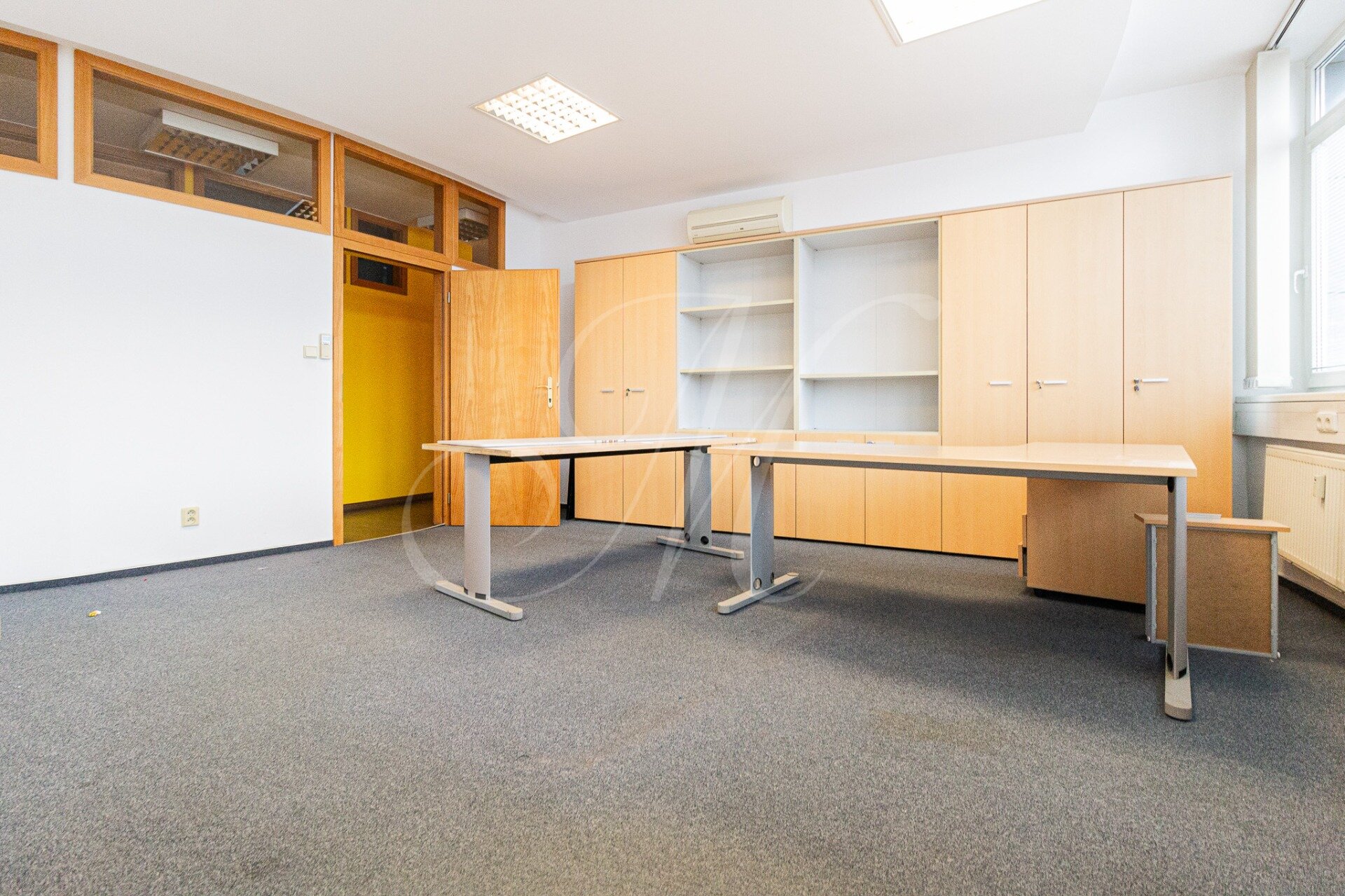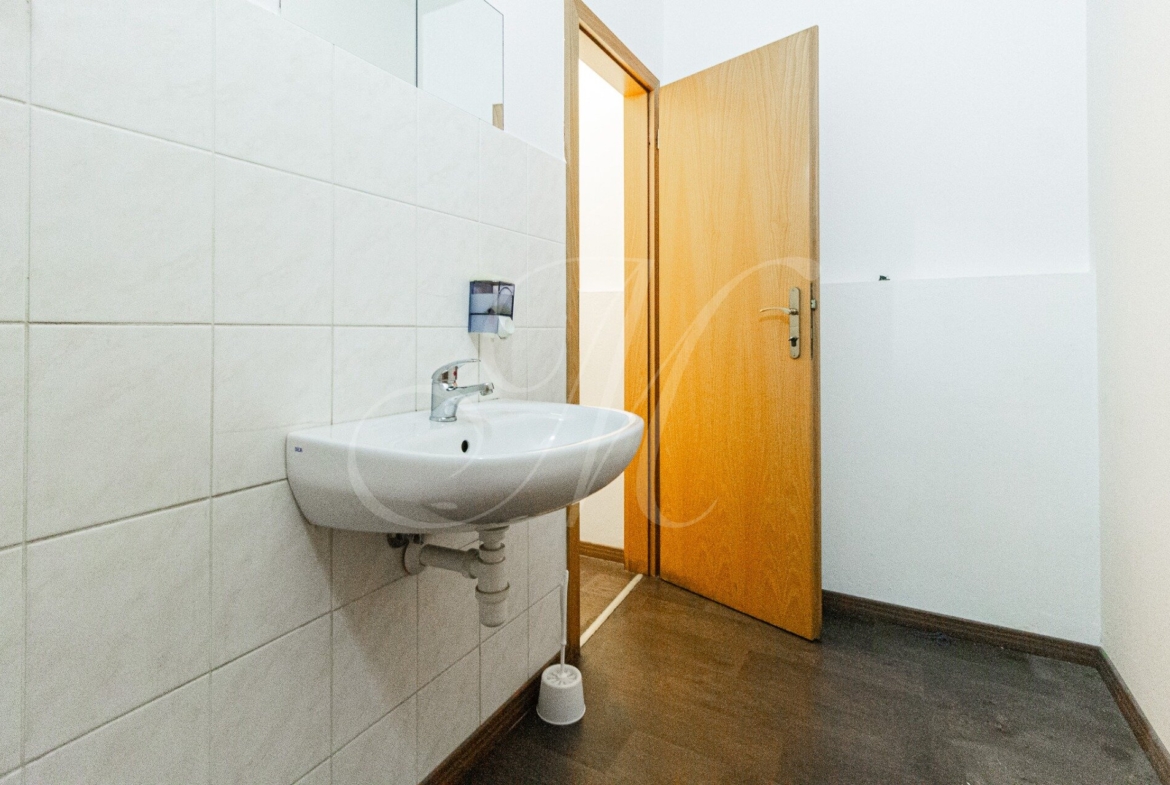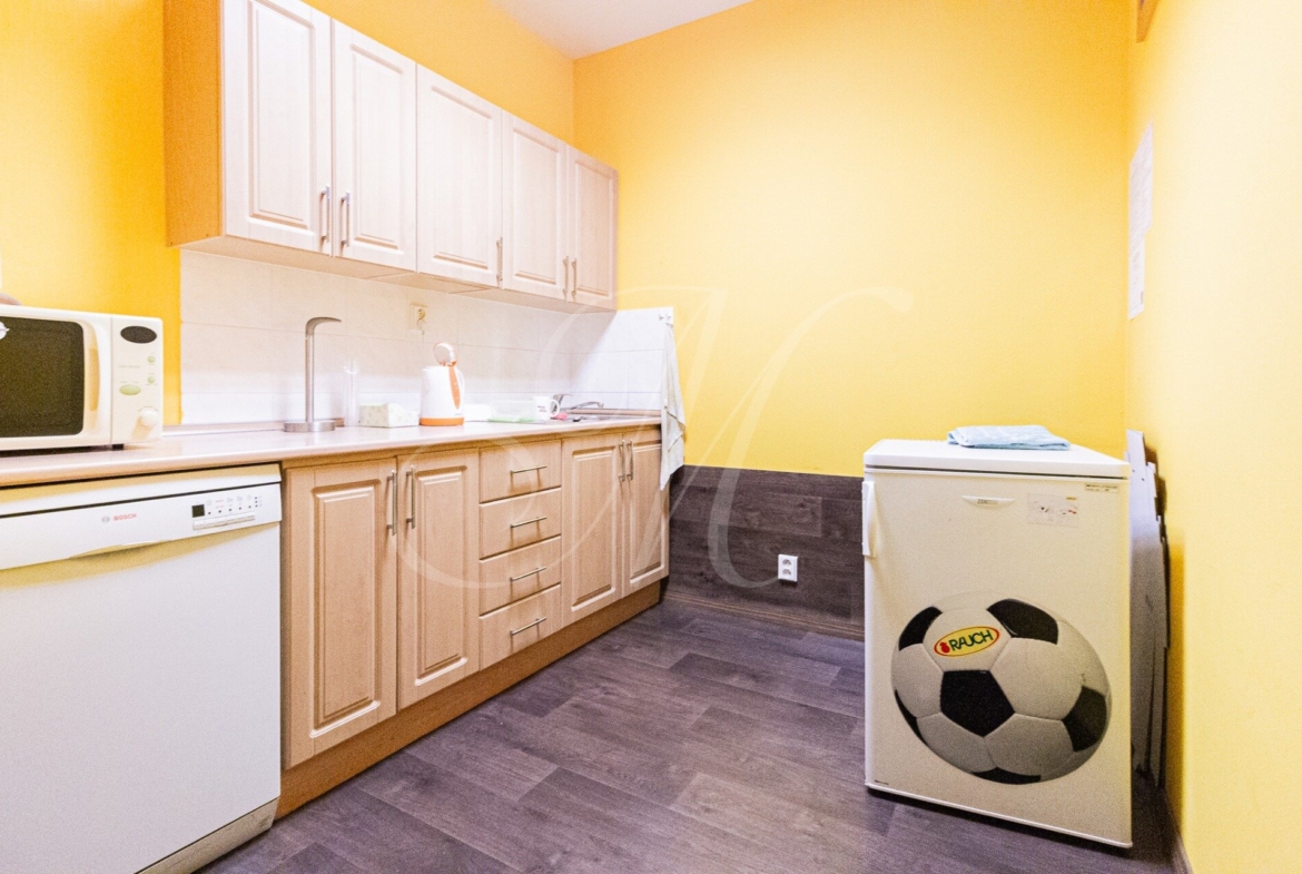 Office consists of an entrance hall, 4 separate offices, a meeting room, a server room, a kitchen (refrigerator, microwave oven, dishwasher) and 2 separate toilets (women’s and men’s). The offices have 2 entrances, from the commercial side and from the residential side.