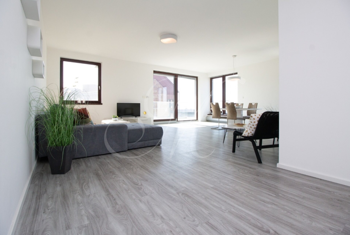 The apartment consists of four rooms, a spacious living room, 3 bedrooms, a modern kitchen, an entrance hall, a bathroom, a toilet, a balcony and a spacious terrace. The apartment is fully furnished. The apartment includes a kitchen with modern appliances and a bathroom with a washing machine and dryer. The apartment has a cellar. The apartment is fully furnished and air-conditioned.
