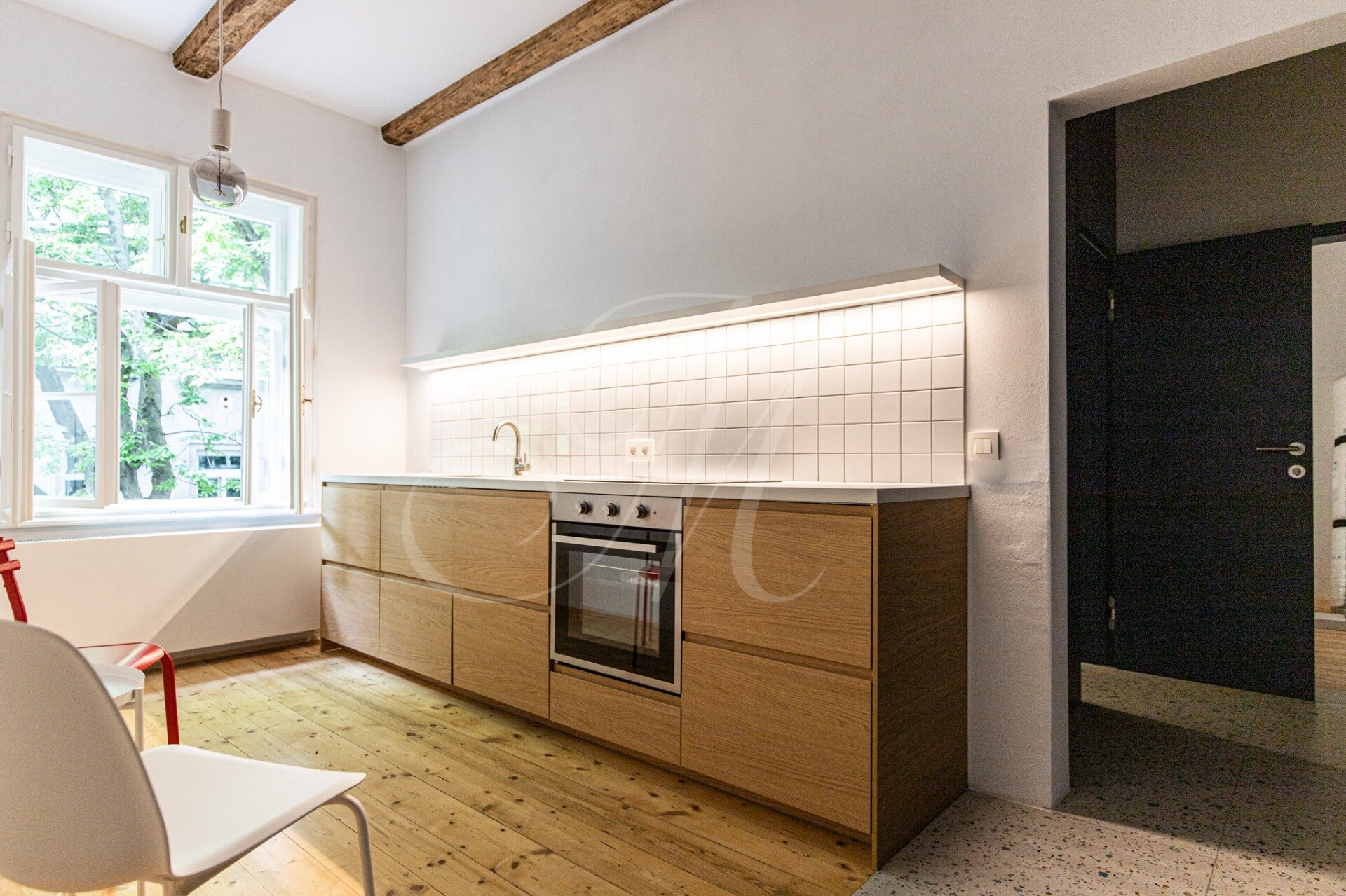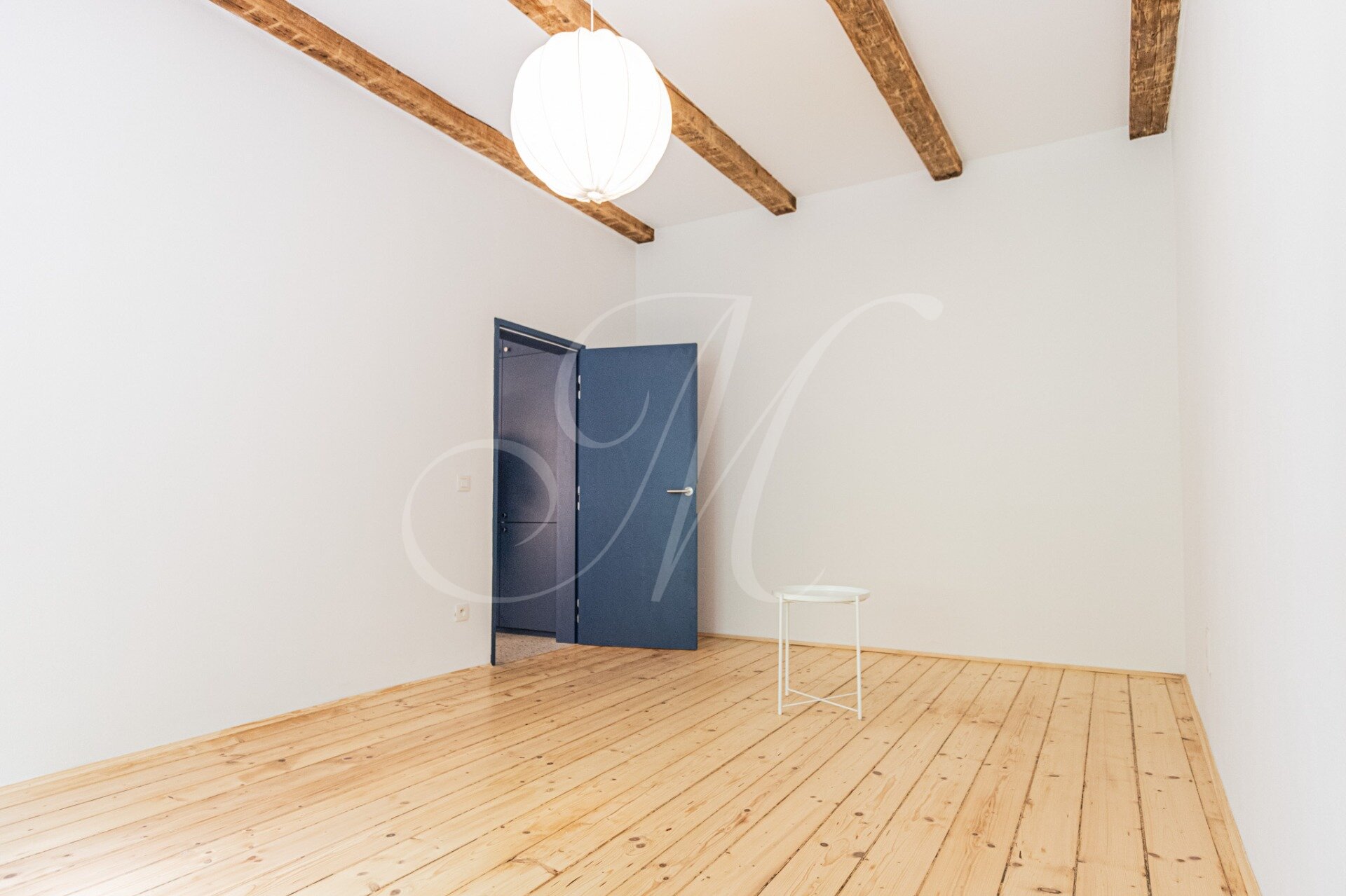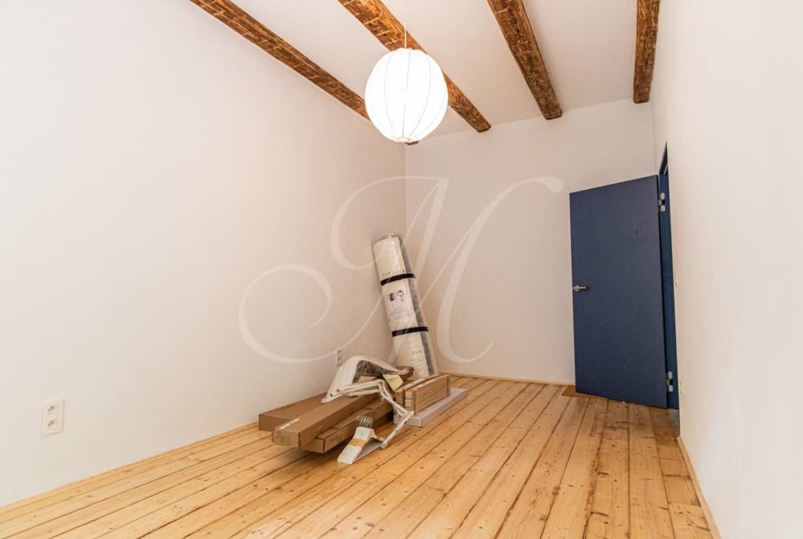 The apartment consists of an entrance hall, a kitchen with a dining area, two separate bedrooms and a bathroom with a shower and a toilet. The apartment has original historical elements (wooden beams, floor, windows), two air conditioning units and its own gas boiler.