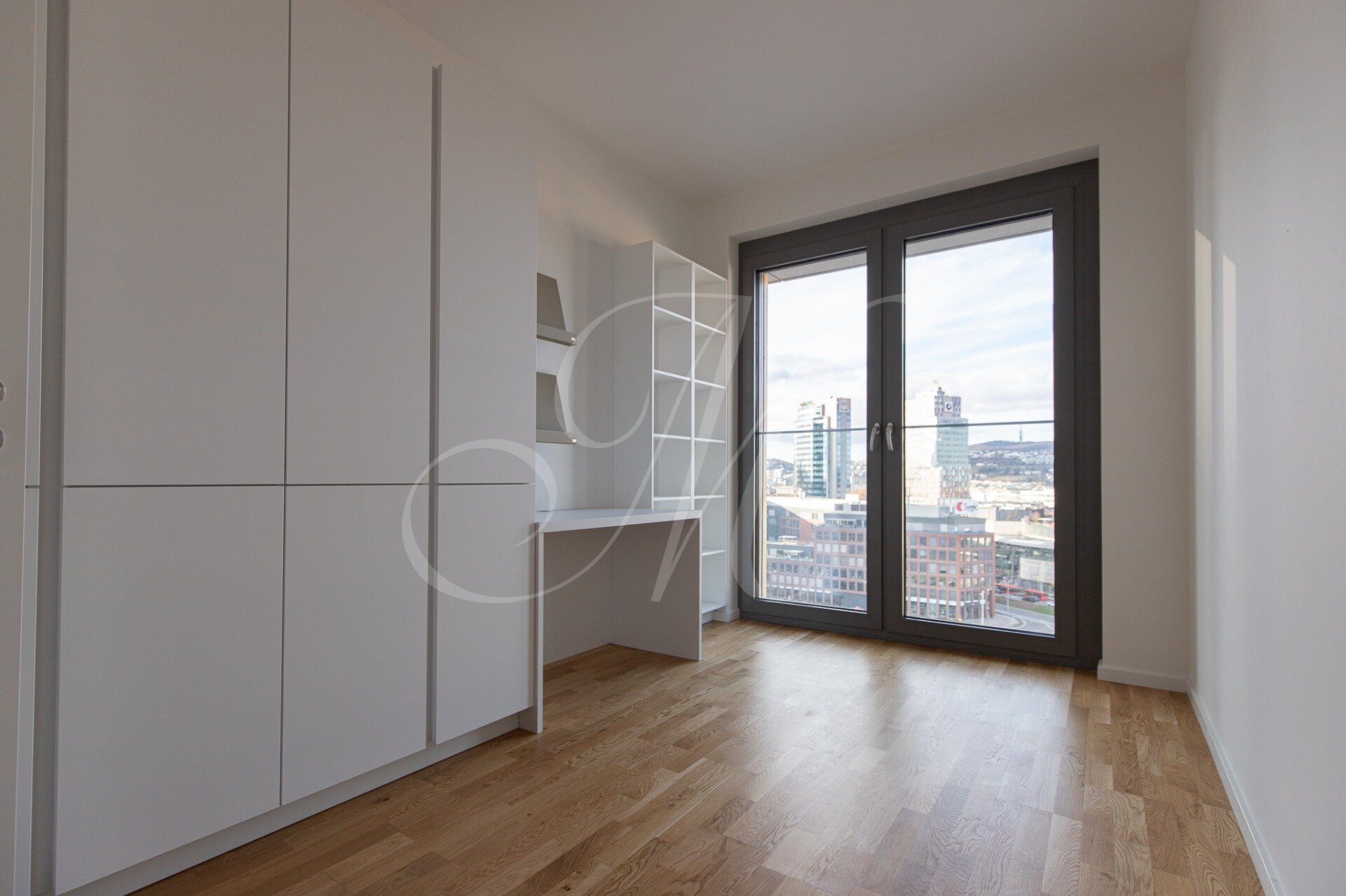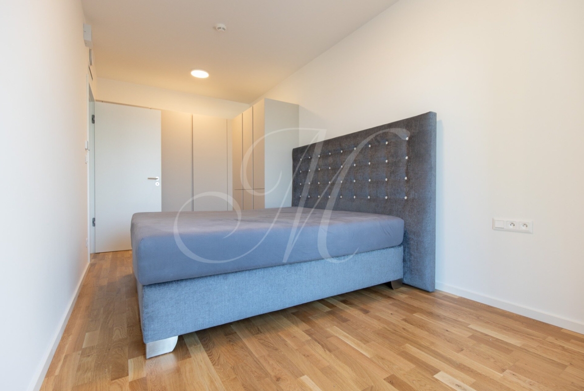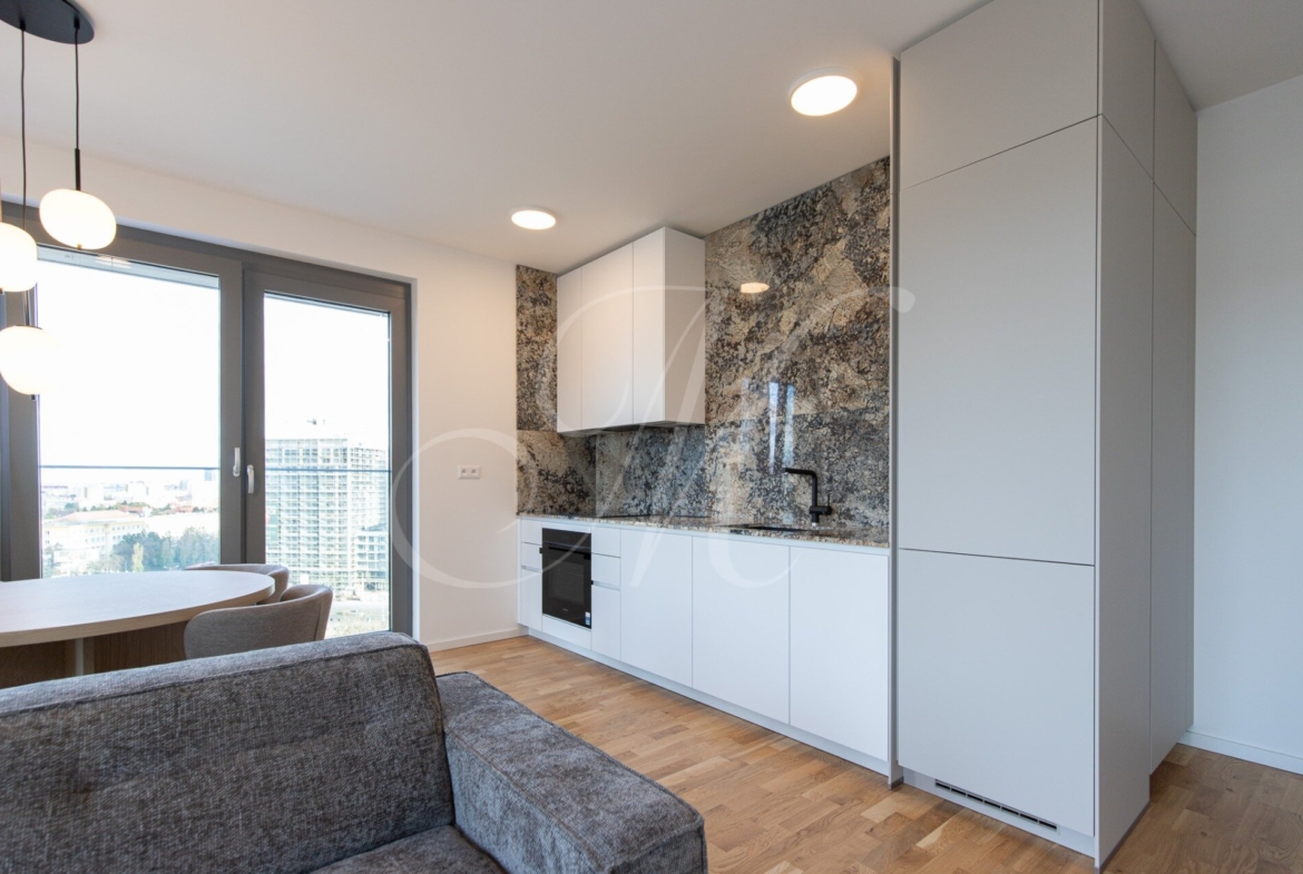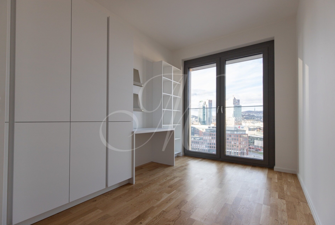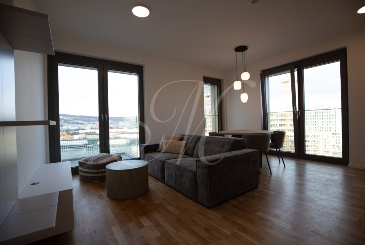 A fully furnished corner 2-bedroom apartment with a floor area of approx. 68 m² is located on the 13th floor of the Metropolis development, offering views of Nivy Mall, Koliba, and the Danube River. The layout includes an entrance hall, a living room, a kitchen, two separate bedrooms, a bathroom, a separate toilet, and two balconies (each 2.48 m²) for exclusive use.