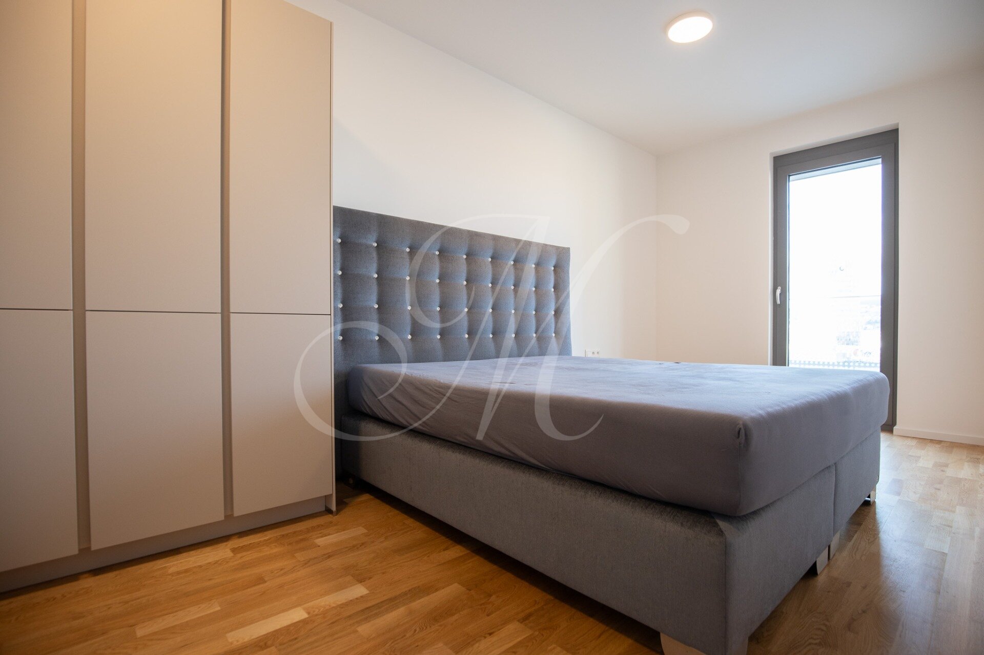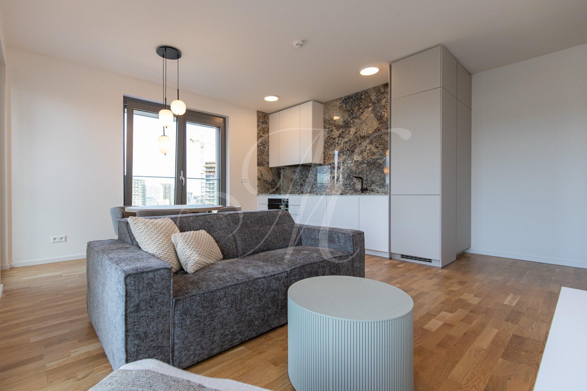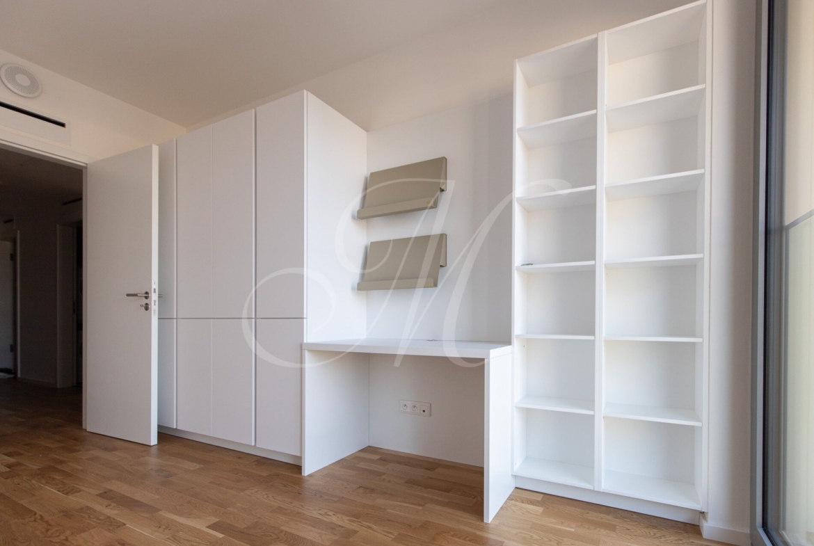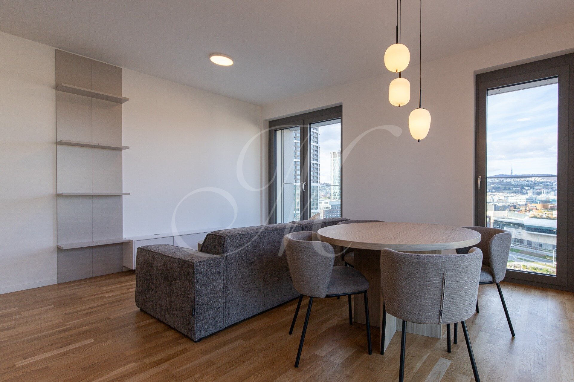 A fully furnished corner 2-bedroom apartment with a floor area of approx. 68 m² is located on the 13th floor of the Metropolis development, offering views of Nivy Mall, Koliba, and the Danube River. The layout includes an entrance hall, a living room, a kitchen, two separate bedrooms, a bathroom, a separate toilet, and two balconies (each 2.48 m²) for exclusive use.