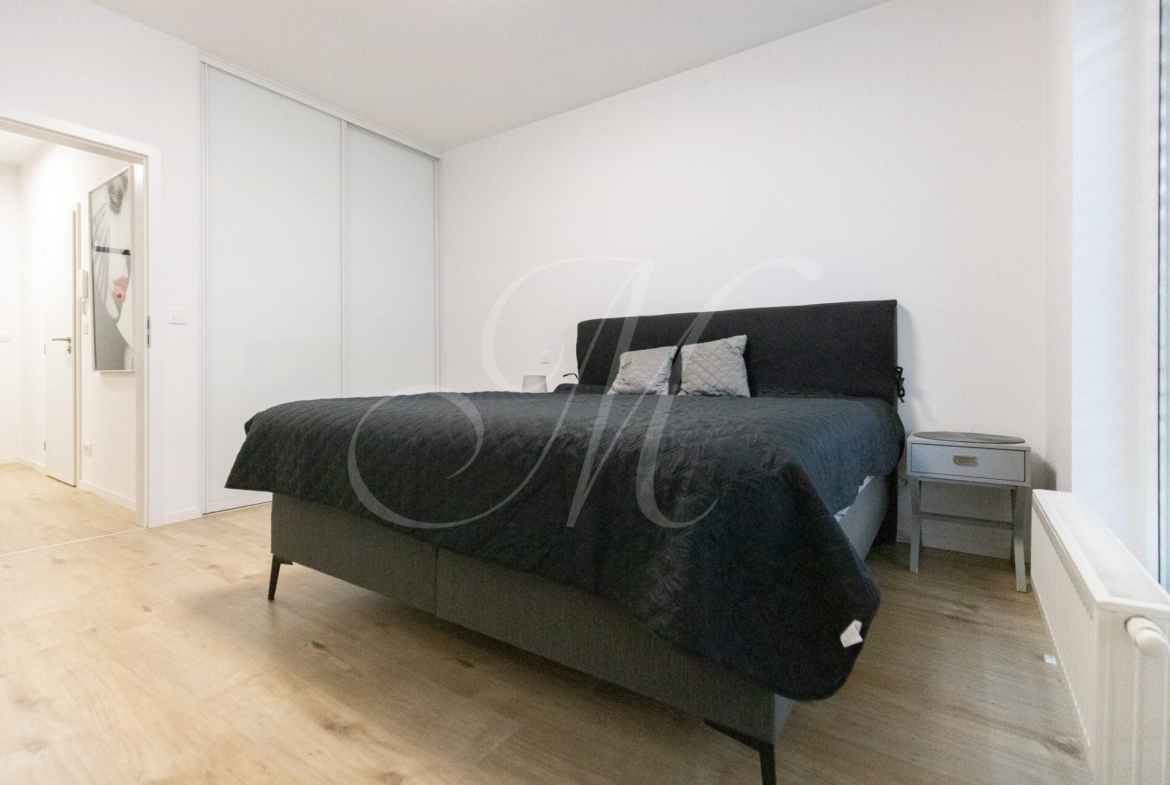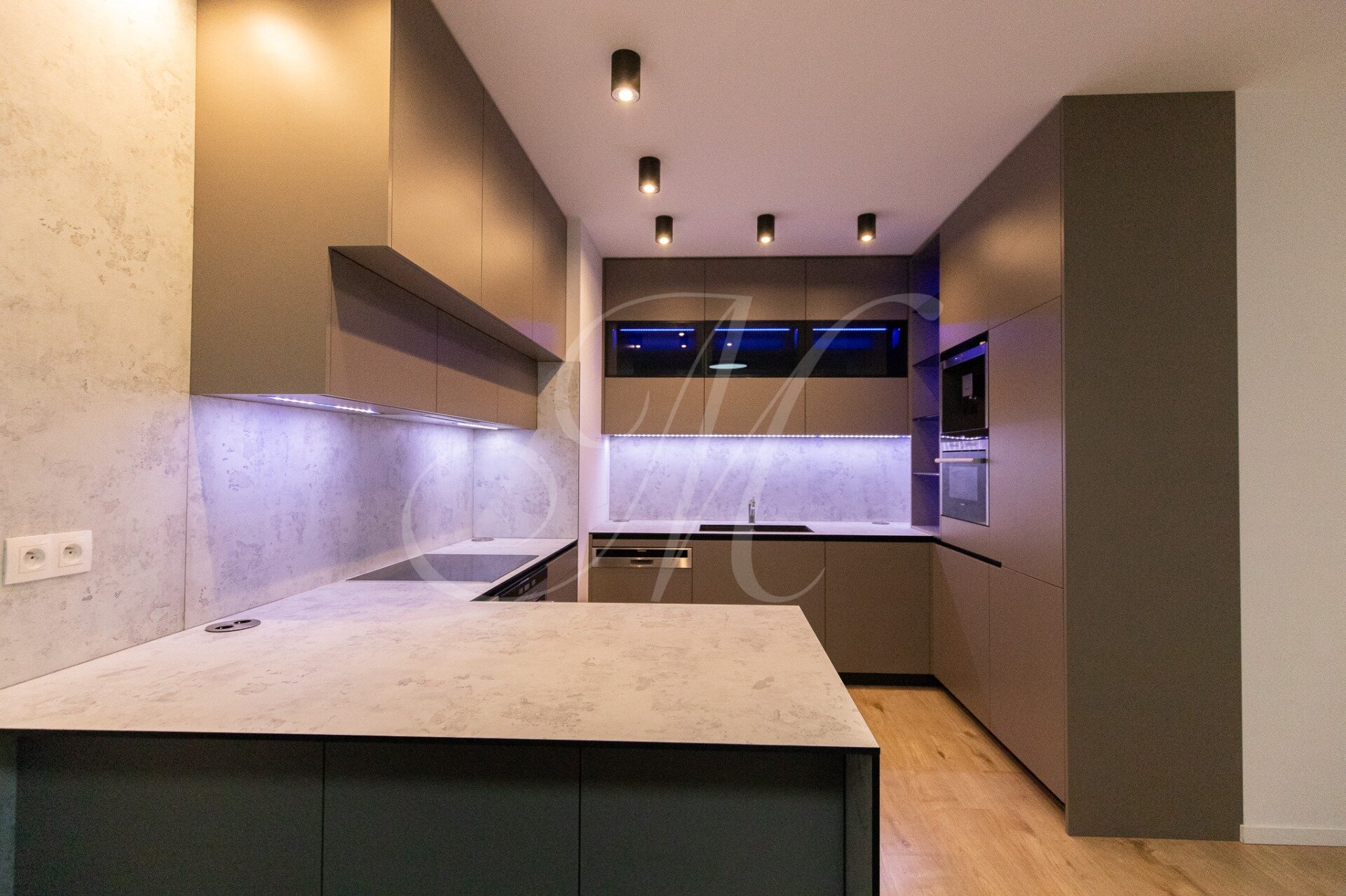 The apartment is furnished with high-quality Scandinavian-style furniture. The kitchen features mood lighting with selectable colors, a bar counter with stools, and Siemens appliances: built-in coffee machine, microwave, fridge-freezer, dishwasher, oven, induction cooktop and extractor. A LG washer-dryer is also included.