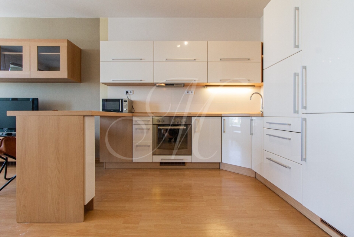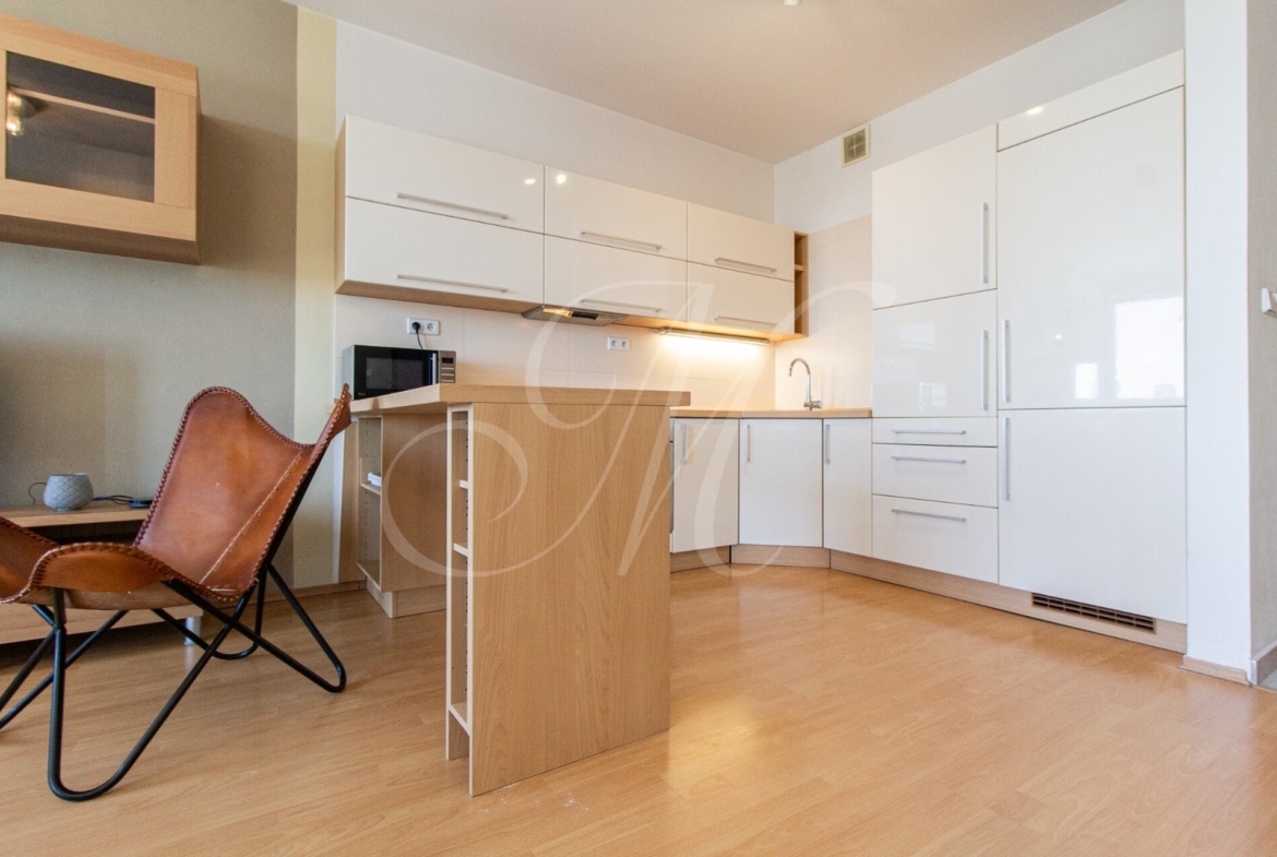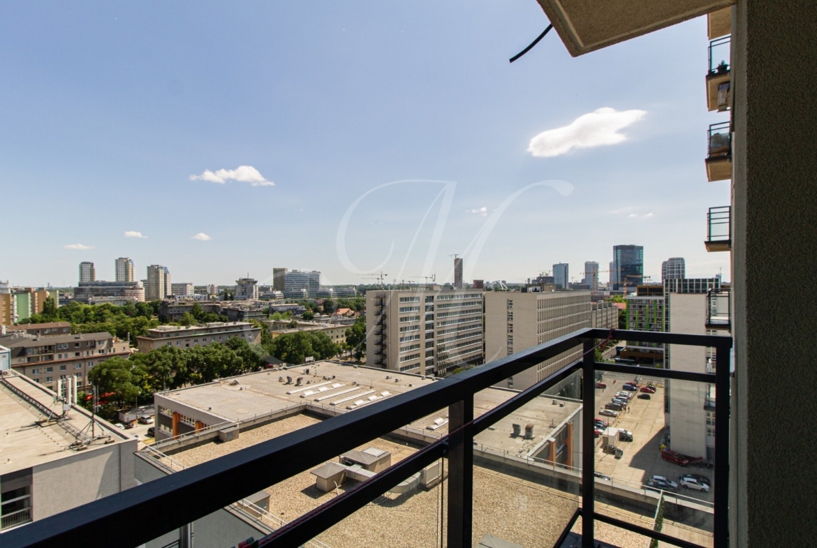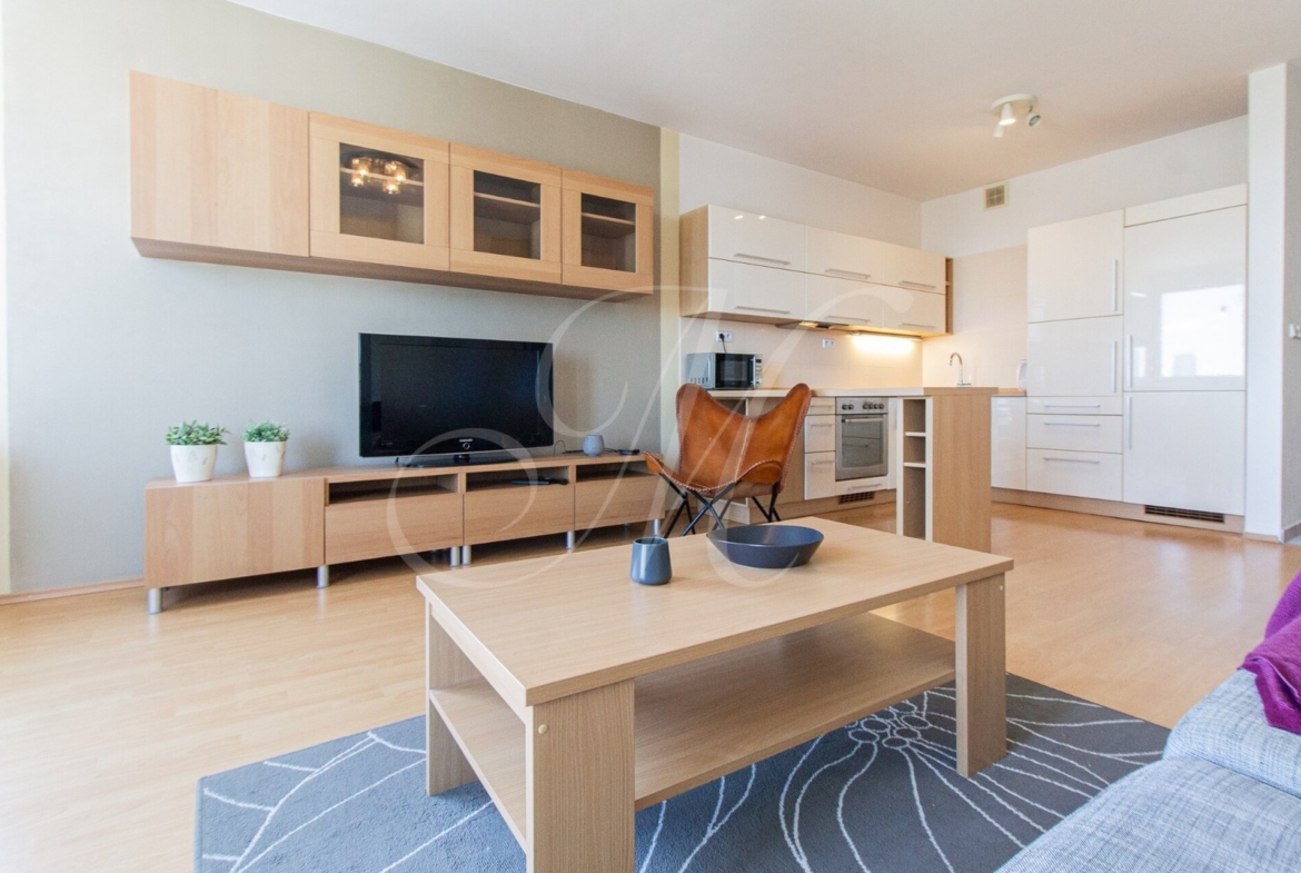 Sunny 2-room apartment with a balcony and parking is located on the 11th (21st) floor in a new building with an elevator. The apartment is rented fully furnished and equipped with appliances (washing machine, TV, dishwasher). The layout offers a bright living room connected to a modern, fully equipped kitchen, a bedroom with plenty of storage space, and a bathroom with a bathtub.