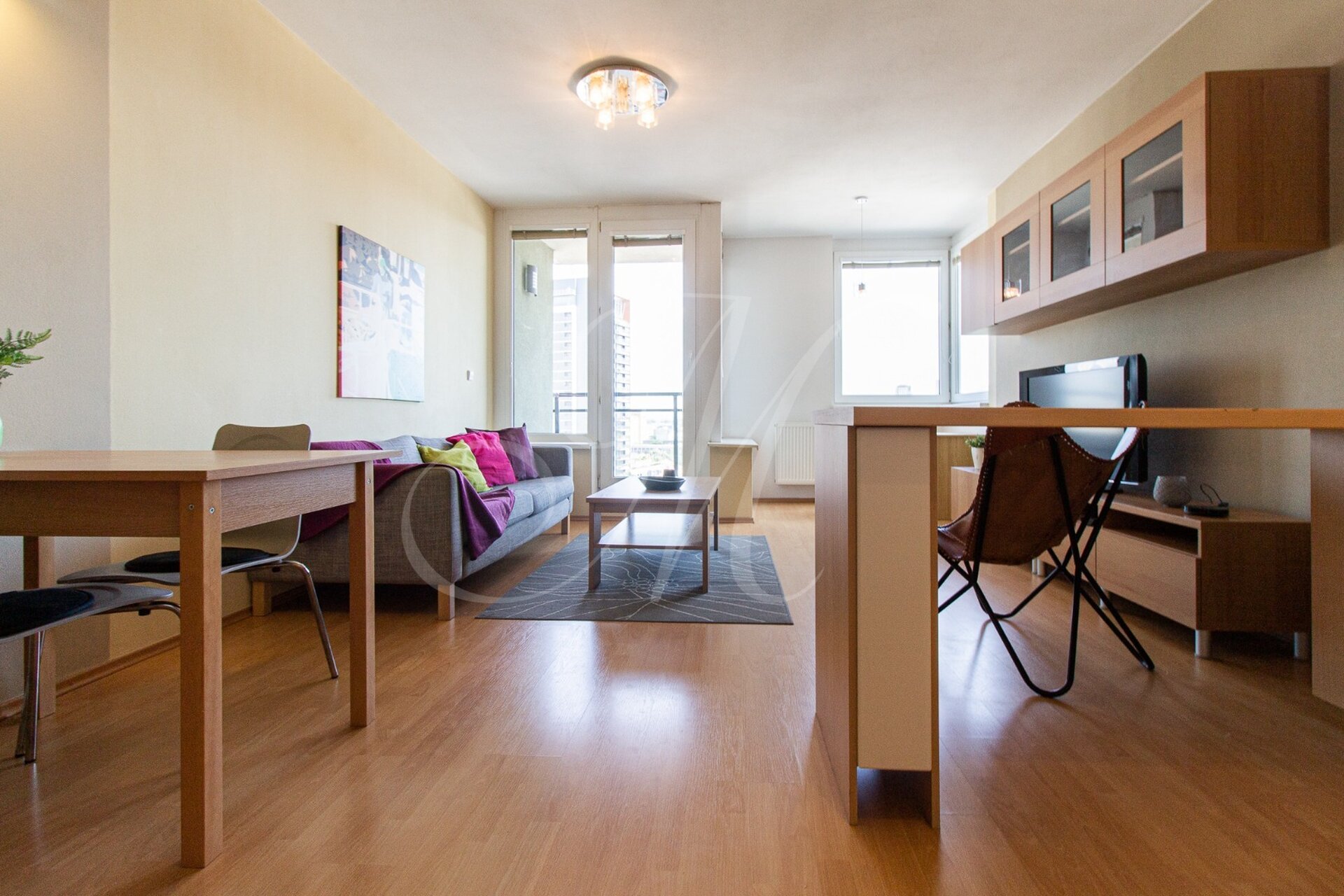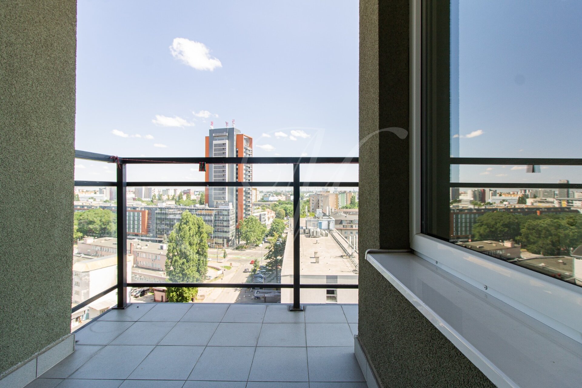 From the living room there is access to a balcony with a view of the city.