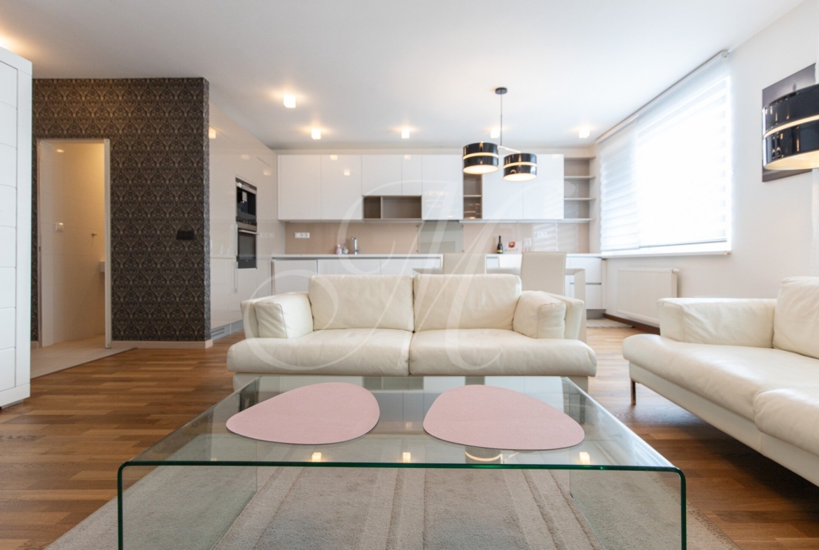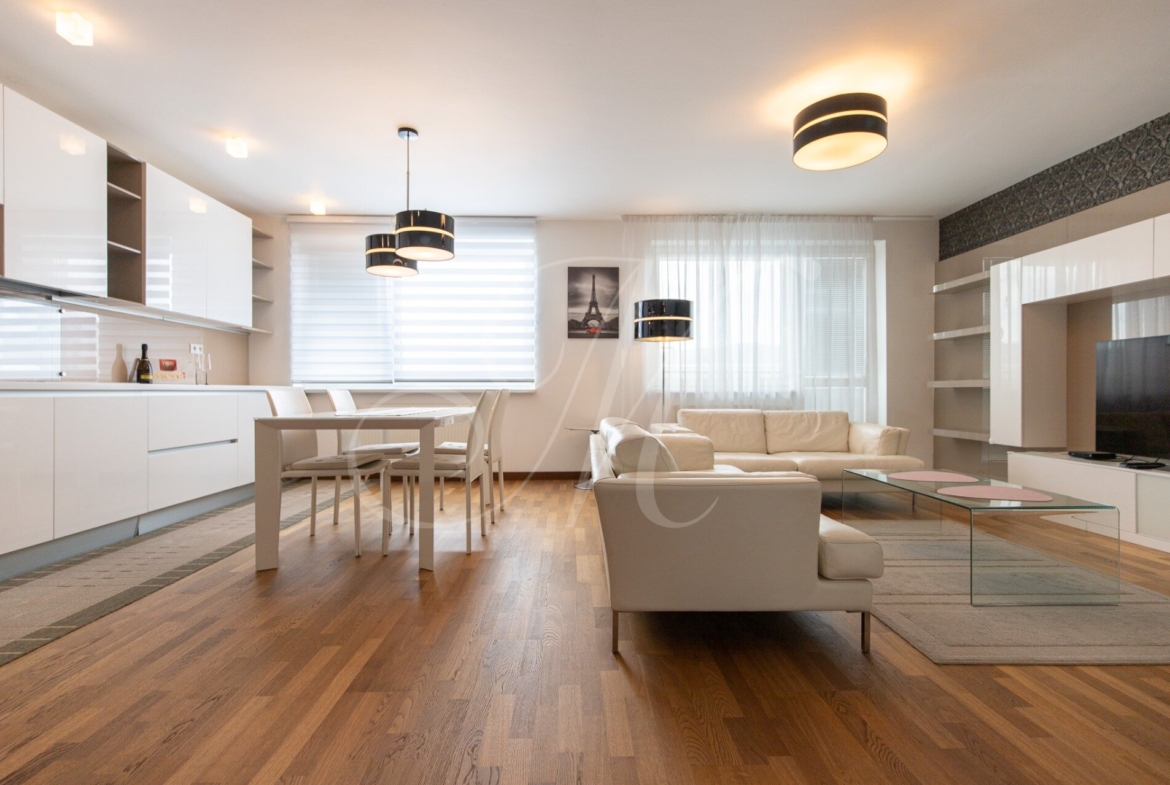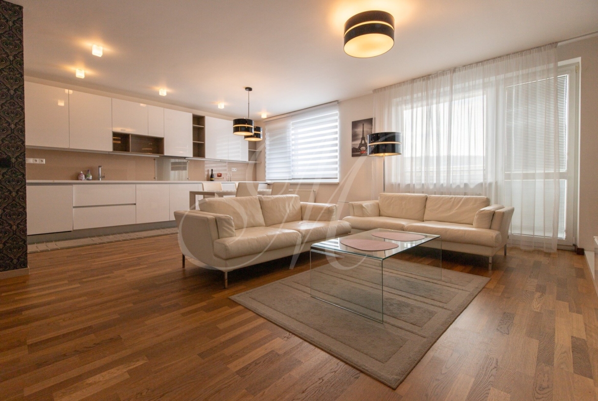 For rent: a high-standard 2-bedroom apartment in the Dom Rustika project, located in the center of Dúbravka. The apartment has a floor area of 110 m², is situated on the 7th floor, and features two balconies and a private garage parking space. It is fully furnished and available immediately.