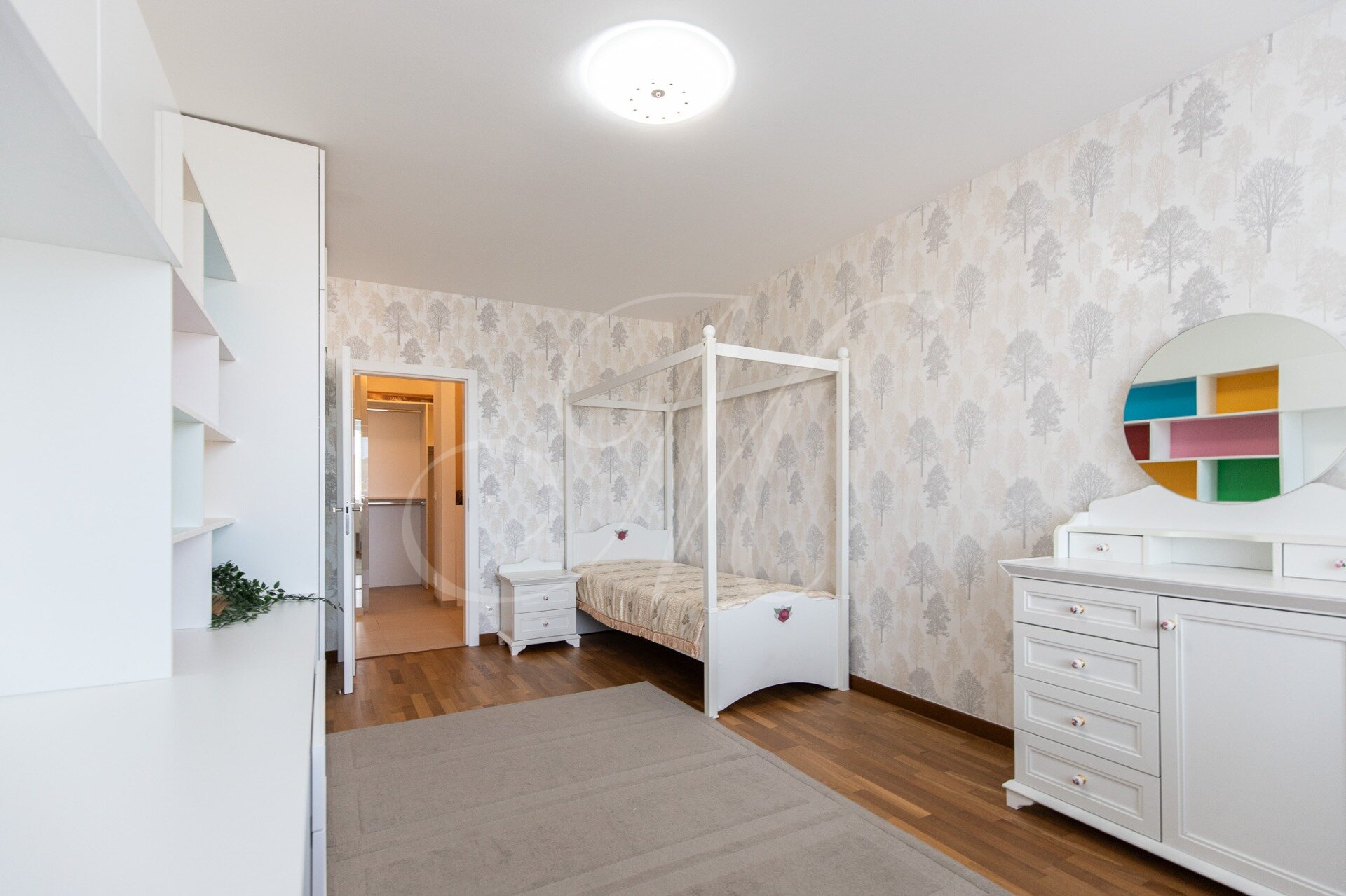 The layout includes a spacious living room with fully equipped kitchen, master bedroom, children’s room, walk-in wardrobe, bathroom with bathtub and shower, and a separate toilet.