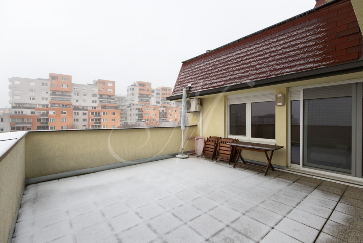We offer for rent a sunny large 3-room apartment with an exceptional terrace in an attractive location by the Danube. The apartment has a total area of 111 m² and has a spacious terrace of 40 m², from which there is a beautiful view of the Danube and Austria. It is located on the 3rd floor of an apartment building.
