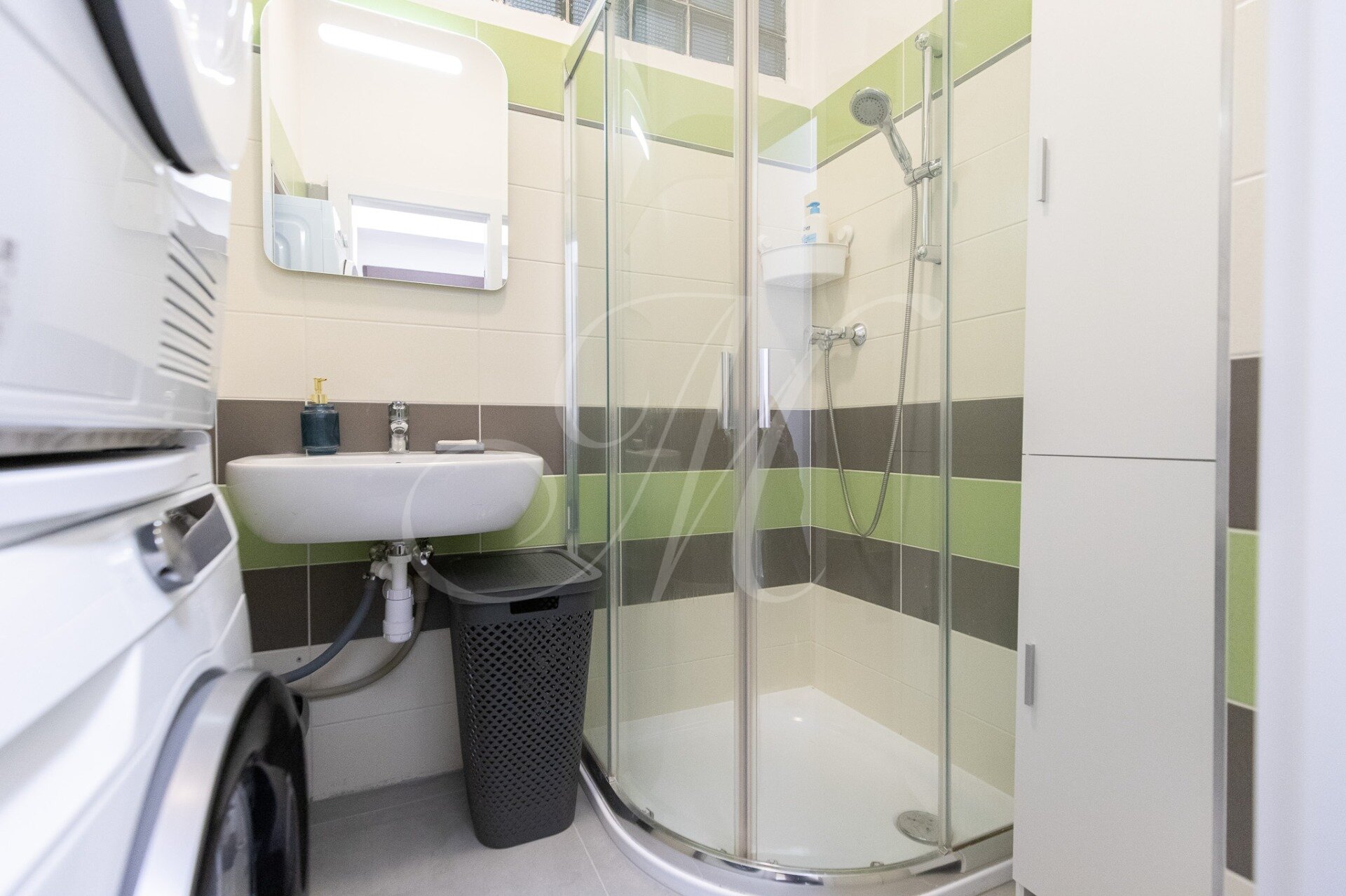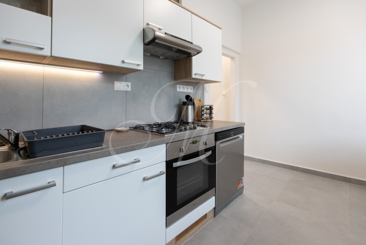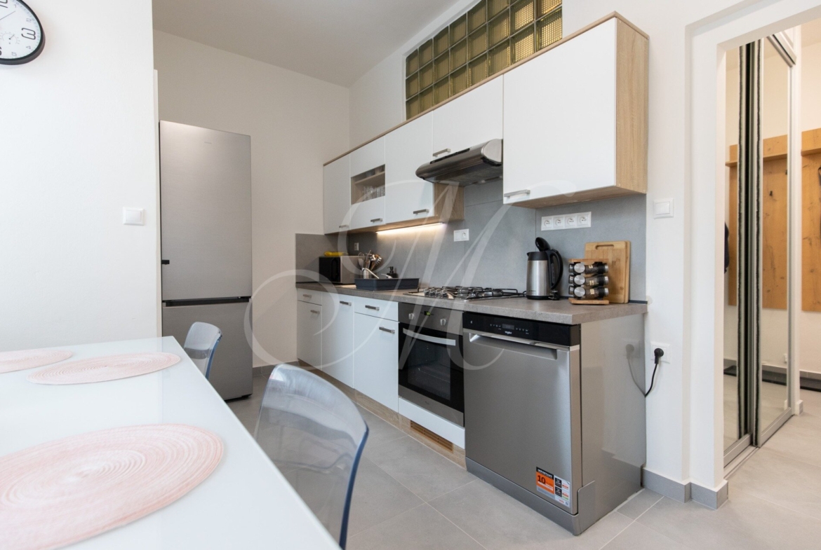 The apartment is fully furnished and equipped with appliances including a dishwasher, washer-dryer, refrigerator with freezer, and TV. WiFi connection and sufficient storage space are available.
