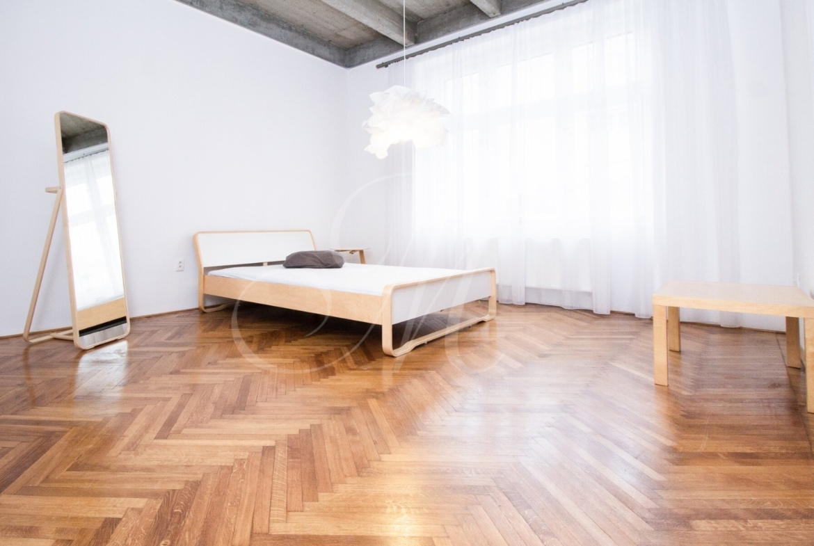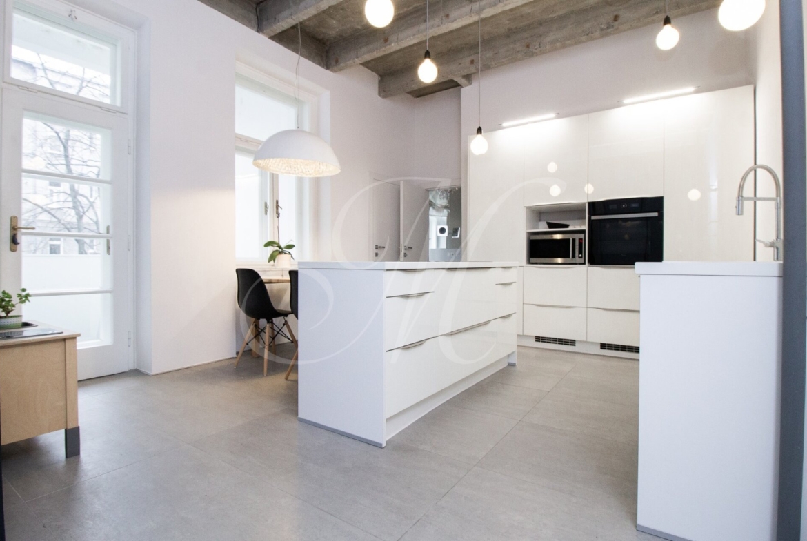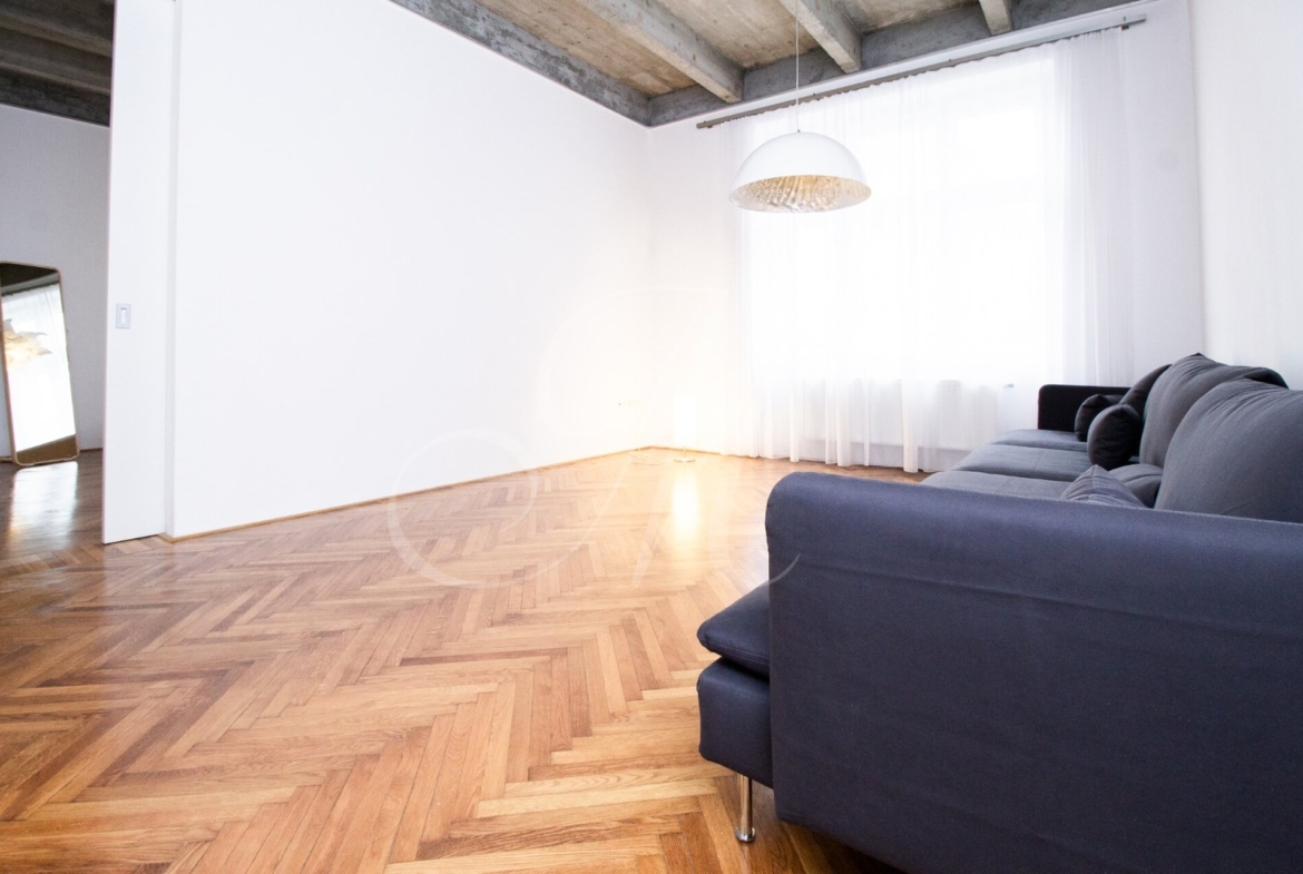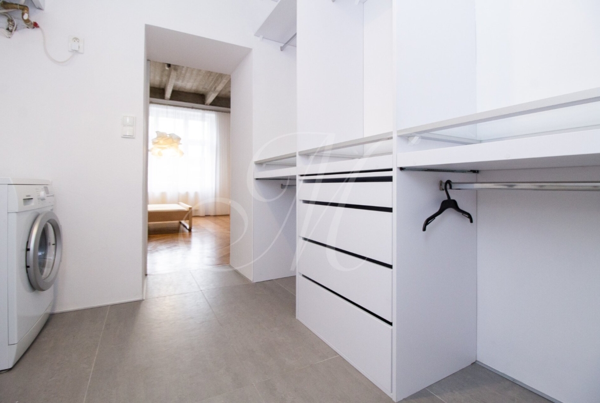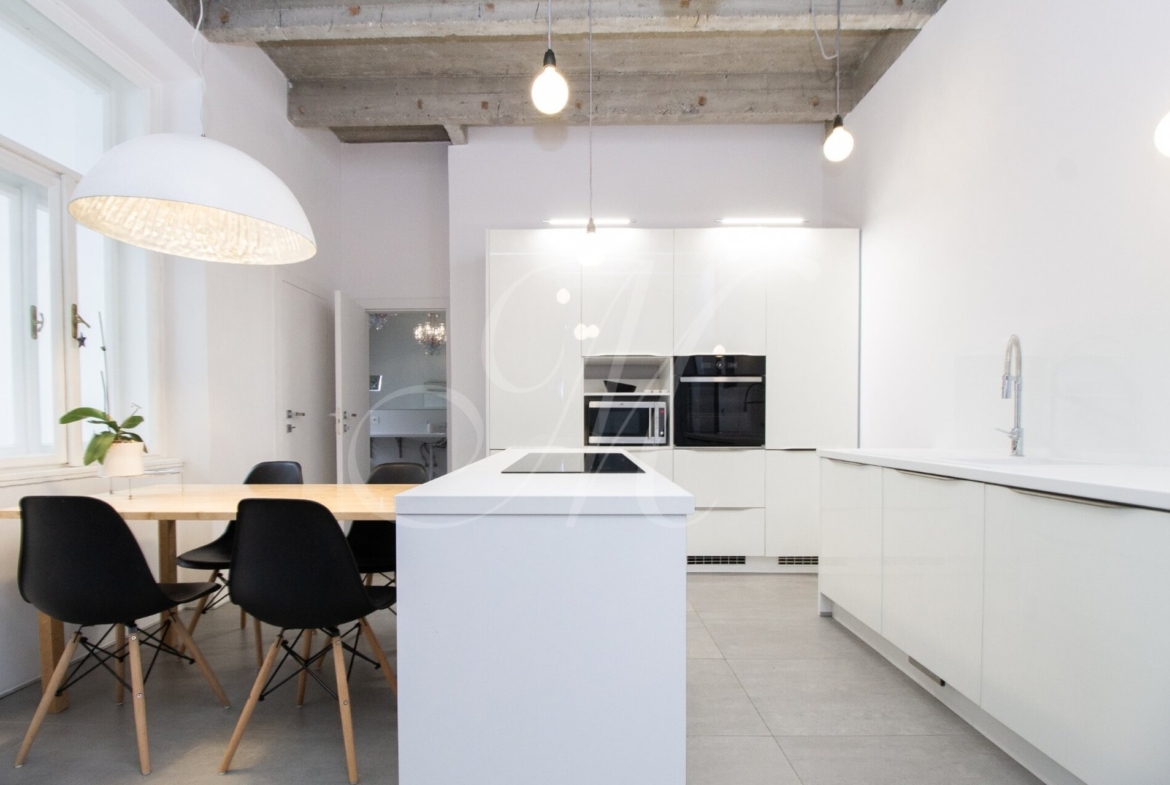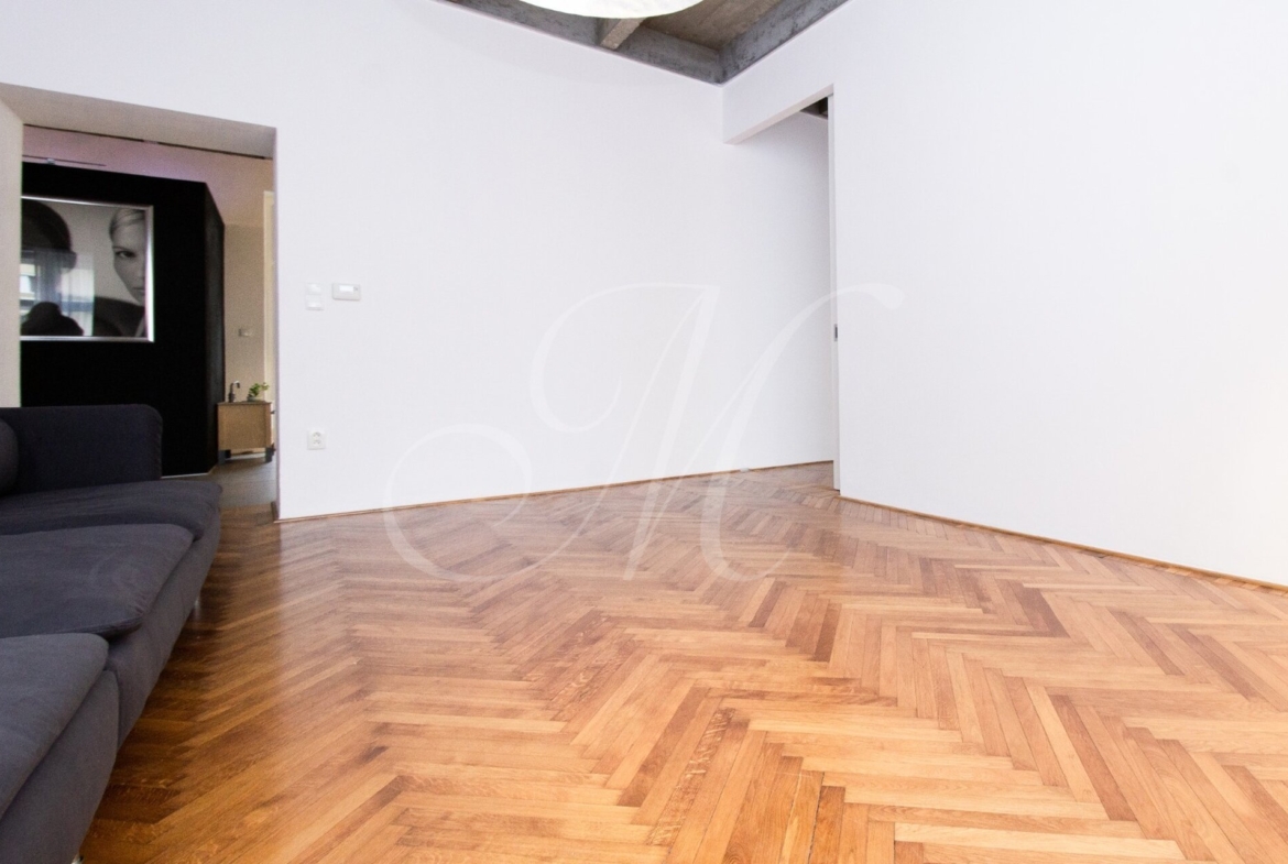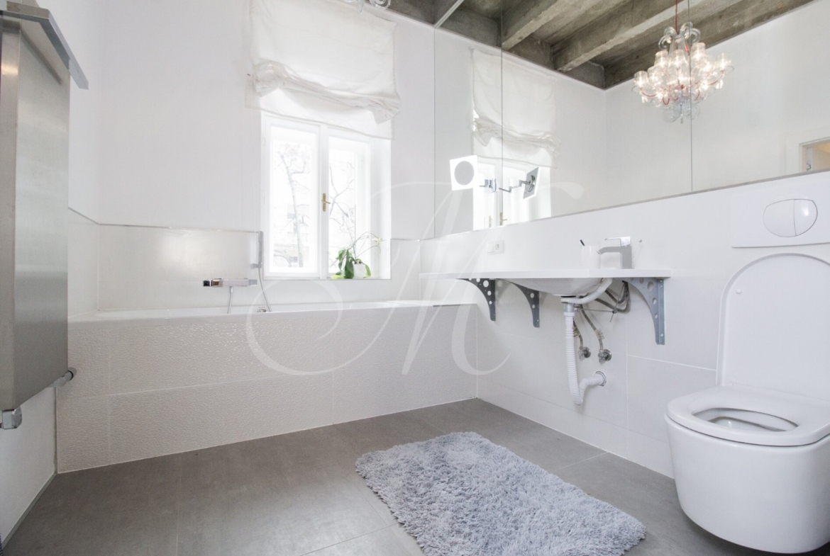 Luxurious newly renovated 2 bedroom apartment with balcony conveniently located in the city center. Spacious and sunny with specific and unique design. Unique concrete high ceilings make this apartment very special. Fully furnished with modern furniture, hardwood floors, high ceilings, spacious brand new kitchen equipped with built-in appliances, walk-in closet, 2 bathrooms ( 1 with tub , 2nd one with shower ), floor heating. Building with elevator, cellar.