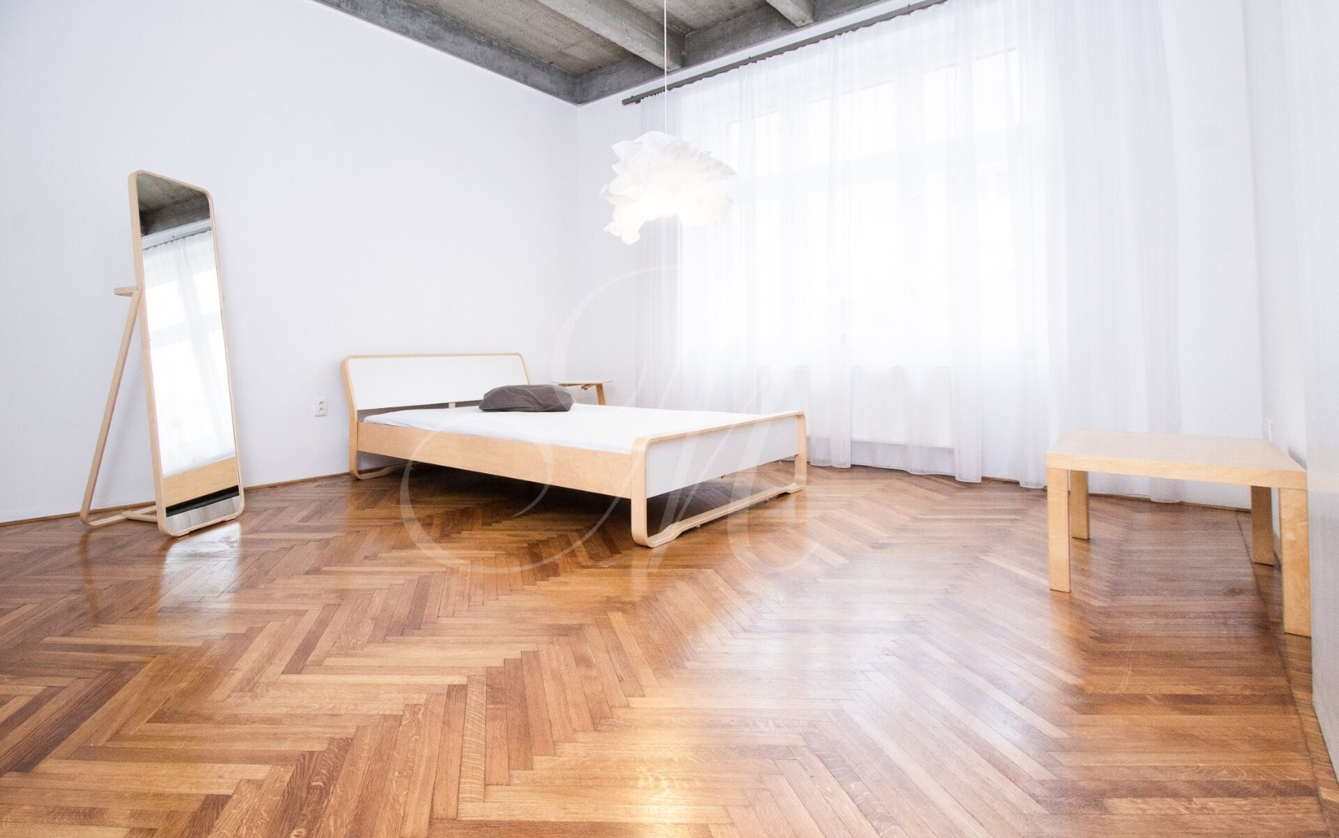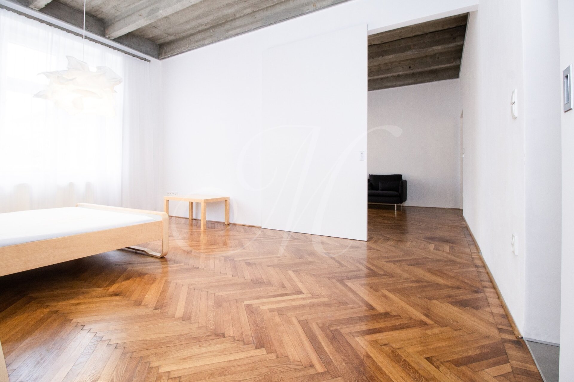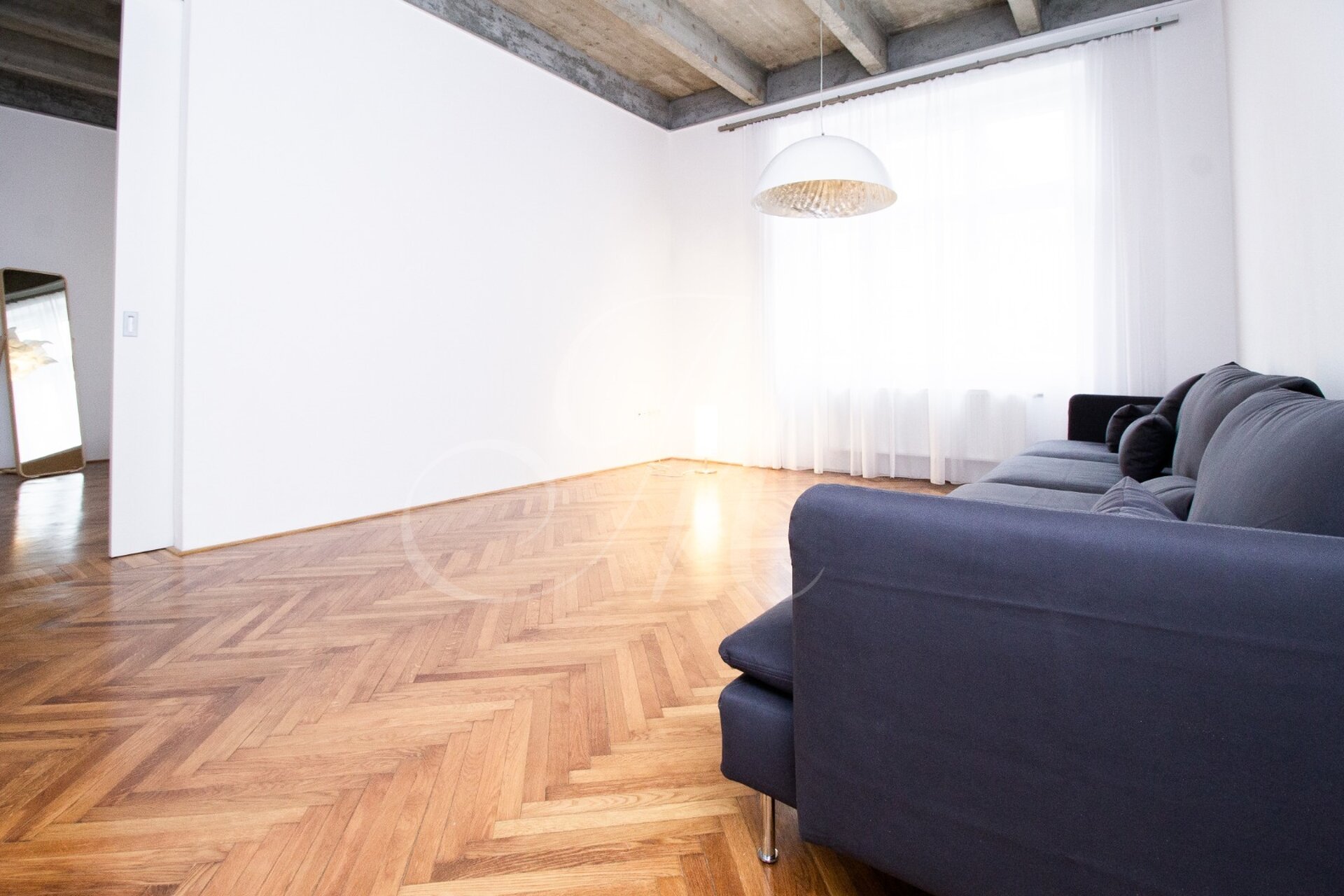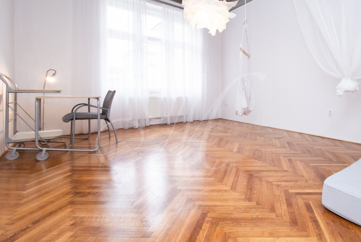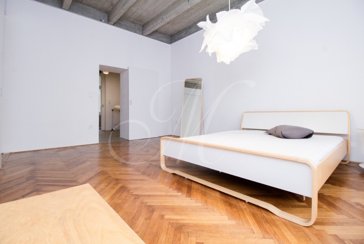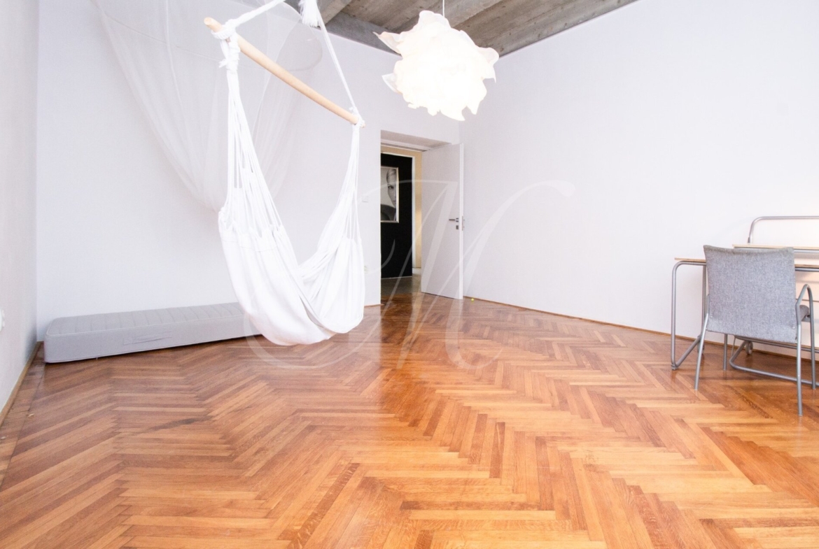 Luxurious newly renovated 2 bedroom apartment with balcony conveniently located in the city center. Spacious and sunny with specific and unique design. Unique concrete high ceilings make this apartment very special. Fully furnished with modern furniture, hardwood floors, high ceilings, spacious brand new kitchen equipped with built-in appliances, walk-in closet, 2 bathrooms ( 1 with tub , 2nd one with shower ), floor heating. Building with elevator, cellar.