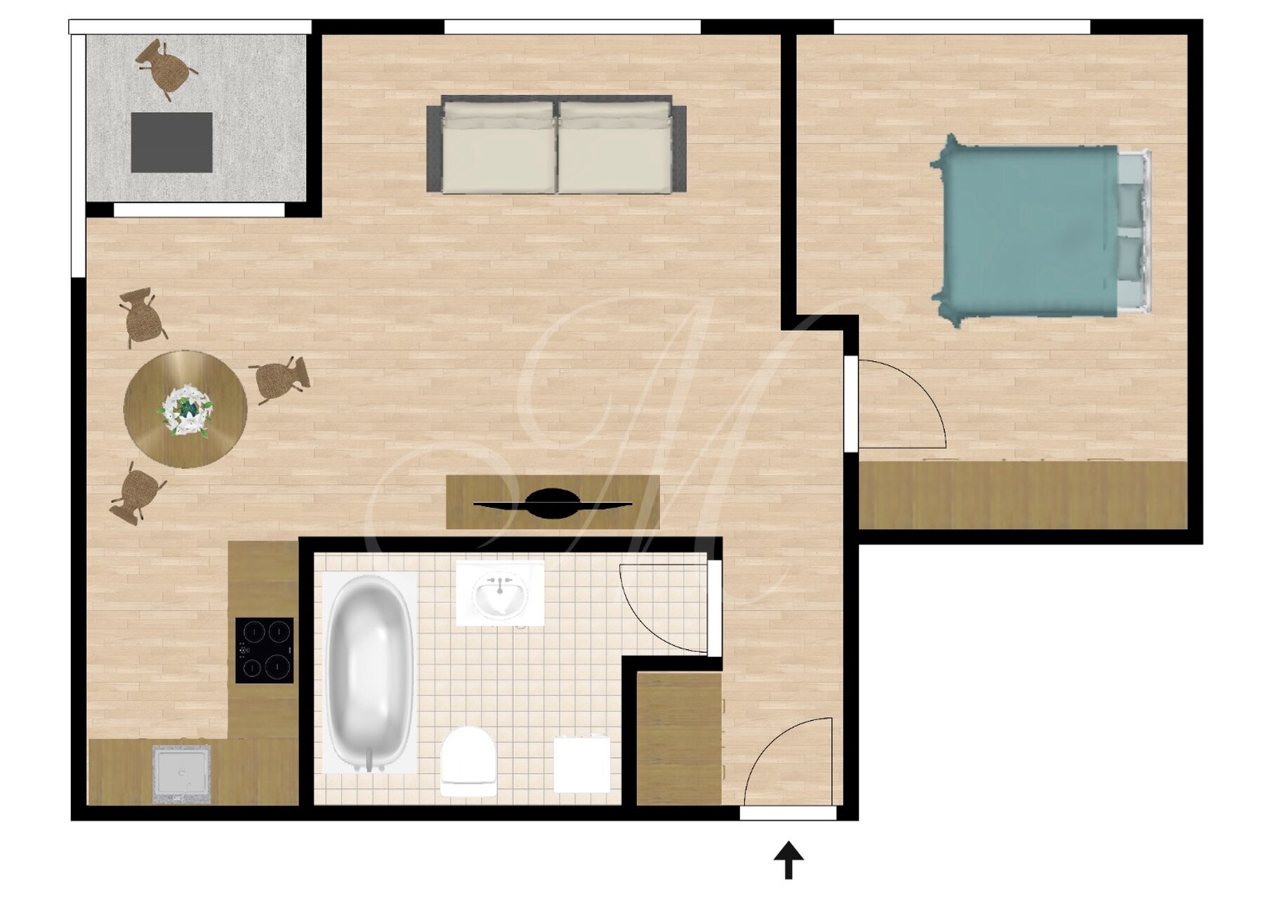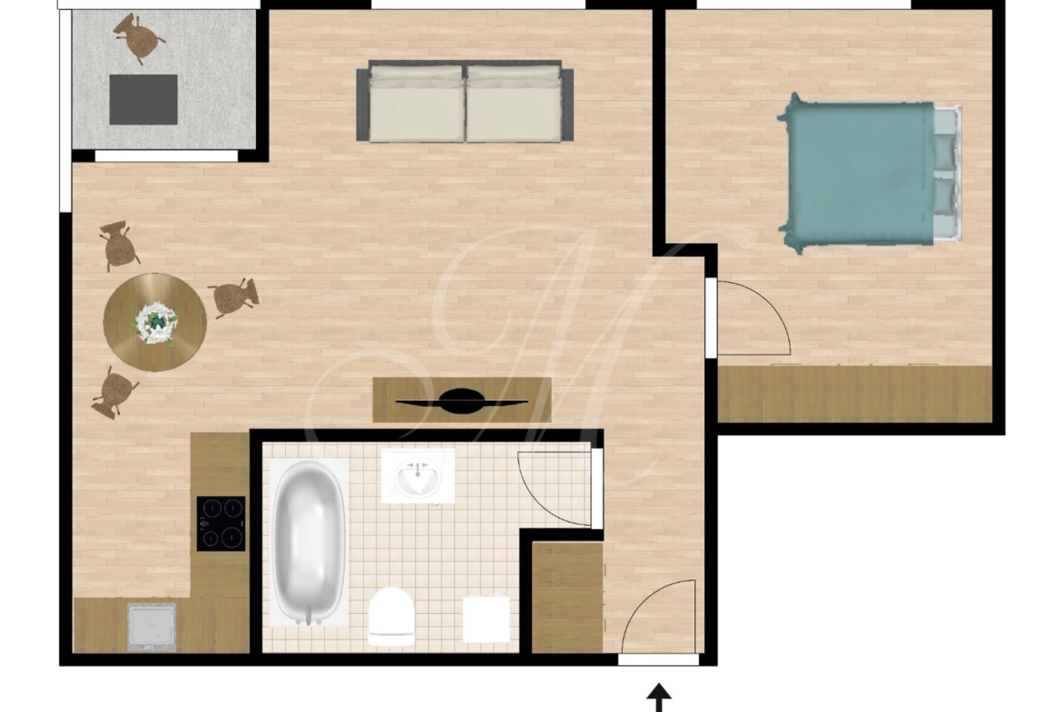 The apartment consists of an entrance hall with access to a bathroom with a bathtub, a toilet and a washing machine. From the entrance hall you enter a bright living room connected to a kitchen area equipped with appliances (fridge, freezer, electric oven, stove, dishwasher), a glazed loggia with a view and a seating area. From the living room there is access to the double bedroom furnished with a wardrobe, storage space and a double bed.
