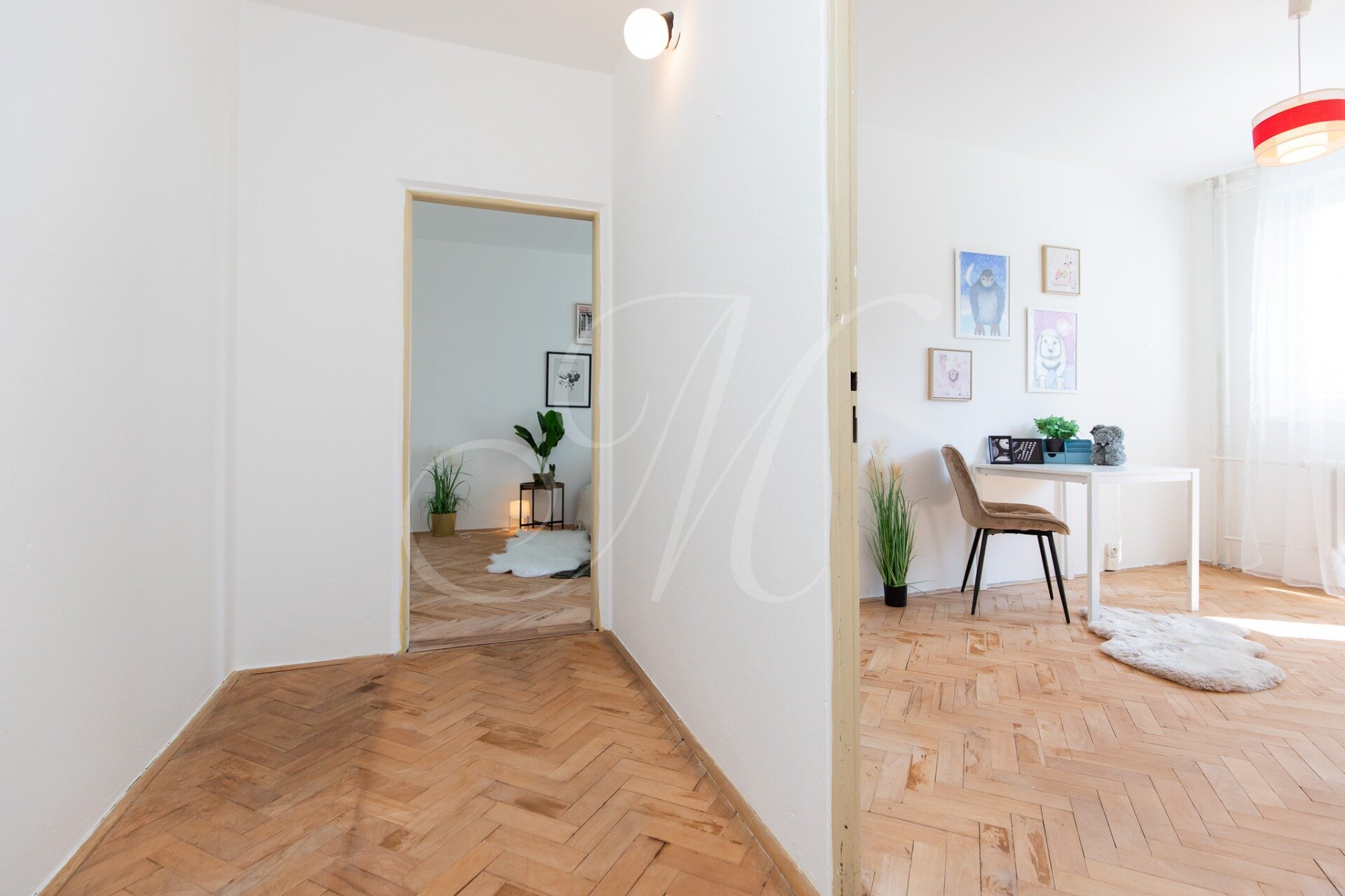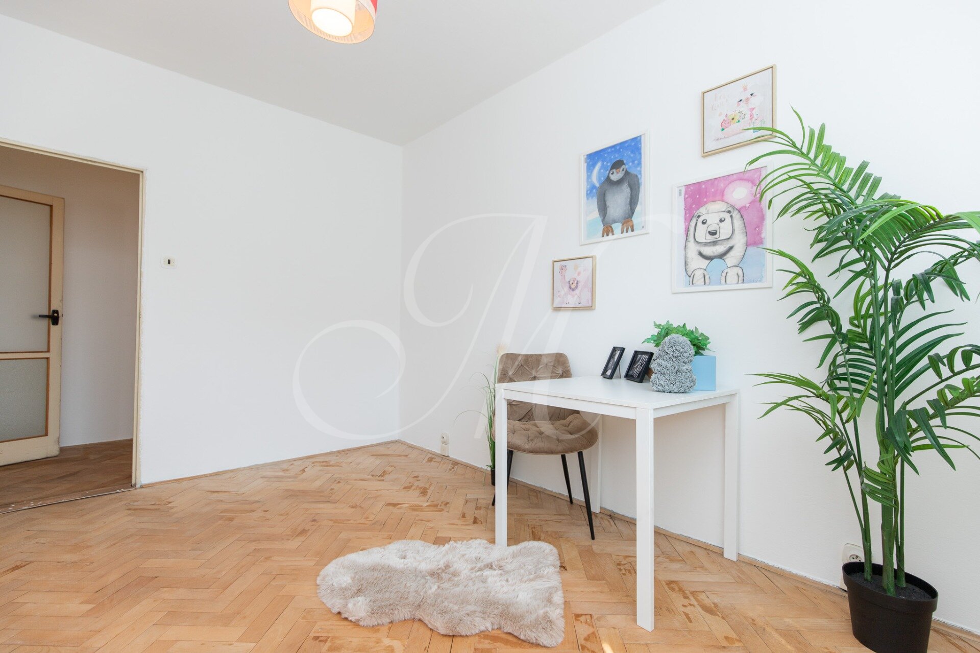 There are original wooden parquet floors throughout the apartment, which need to be sanded for full use. There are plastic windows with blinds.