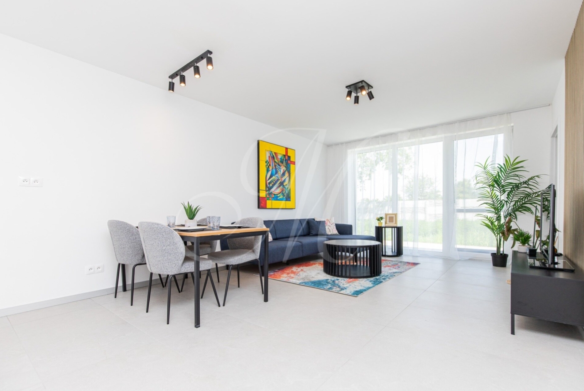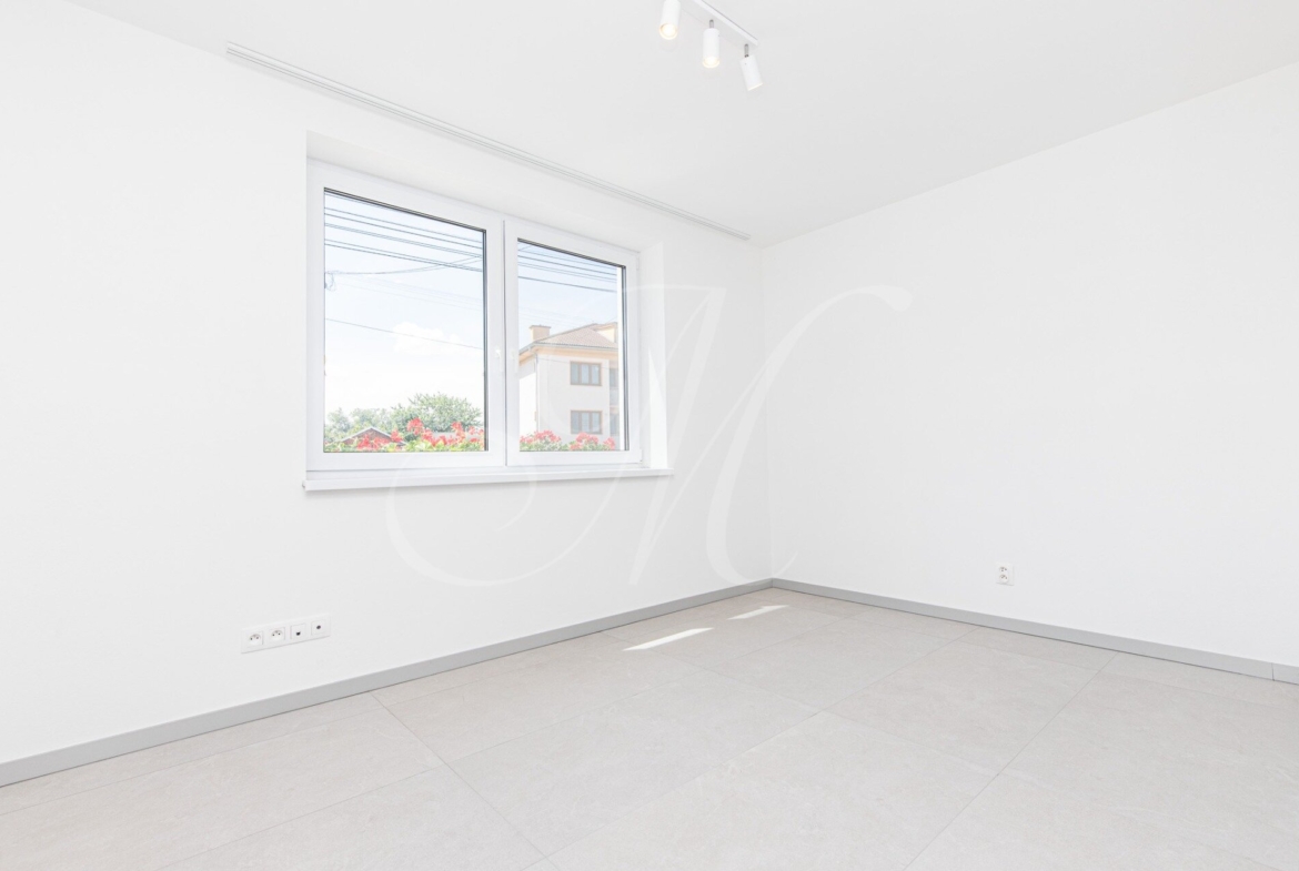 We offer for sale a brand new, as yet unoccupied four-room family house (91.5 m²) with a garden (372 m2) and a terrace (17.5 m²). The family house is part of a semi-detached house.
