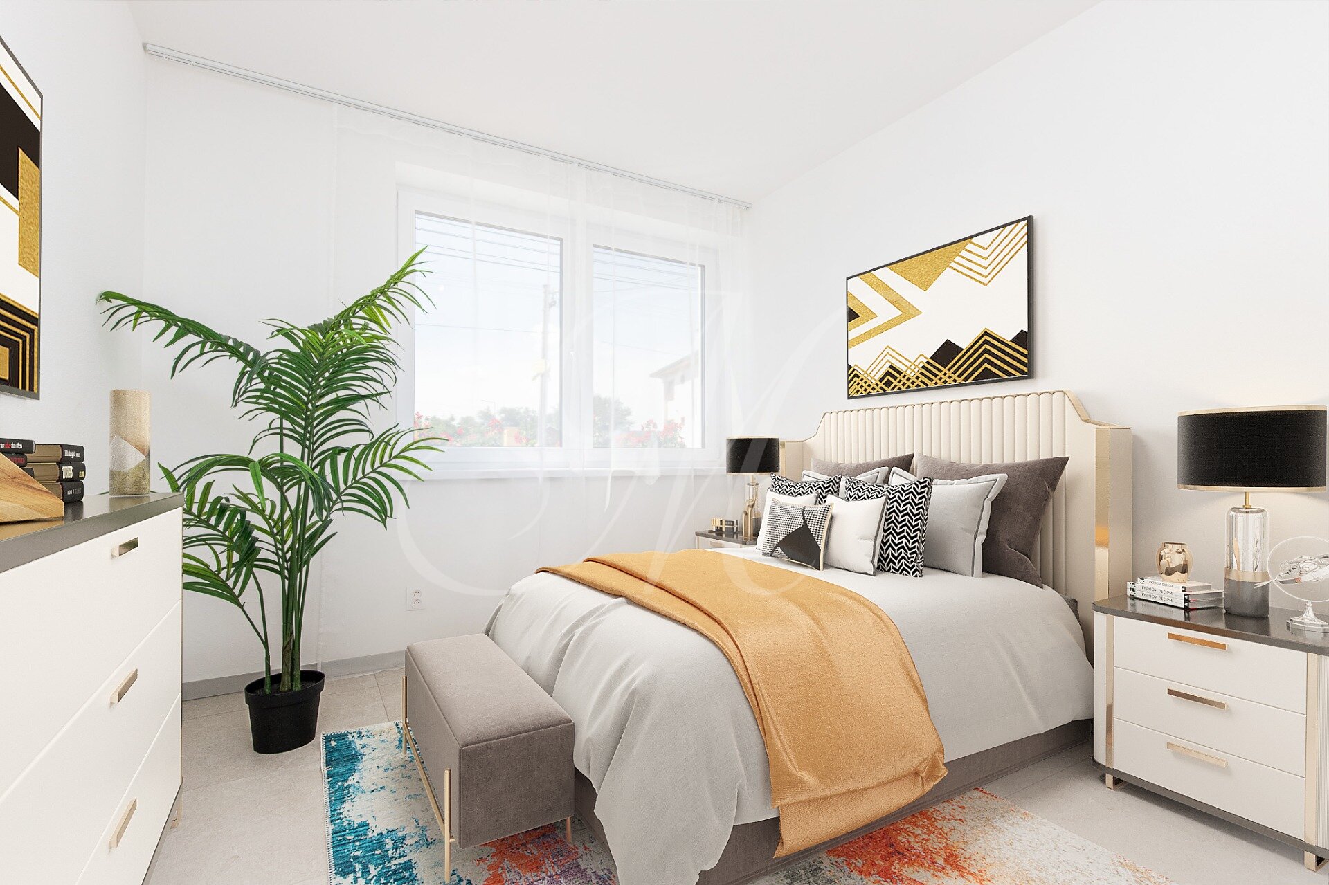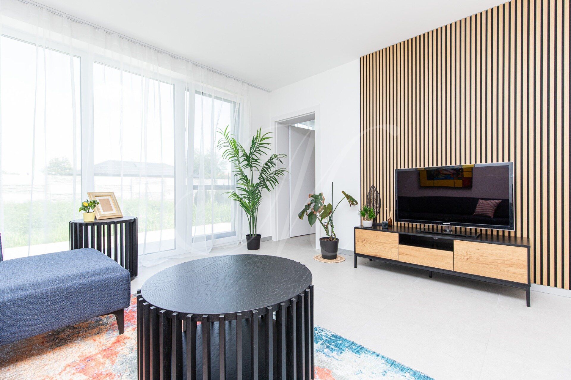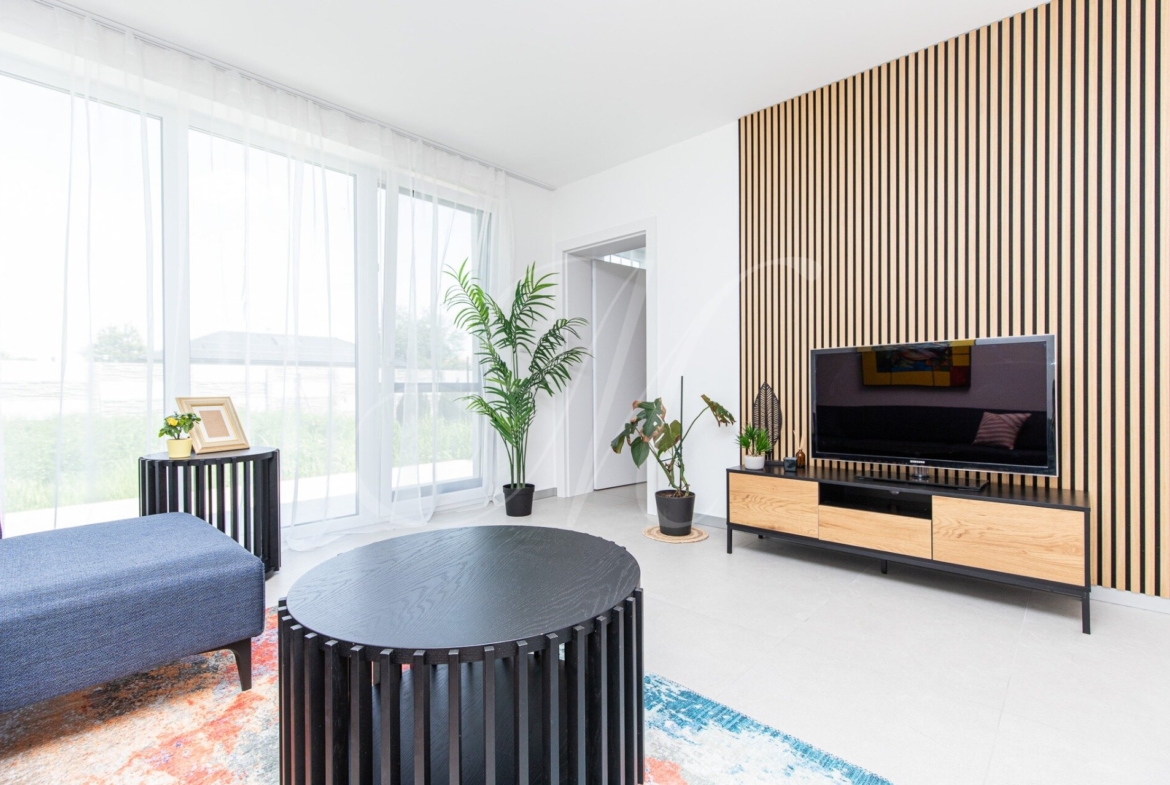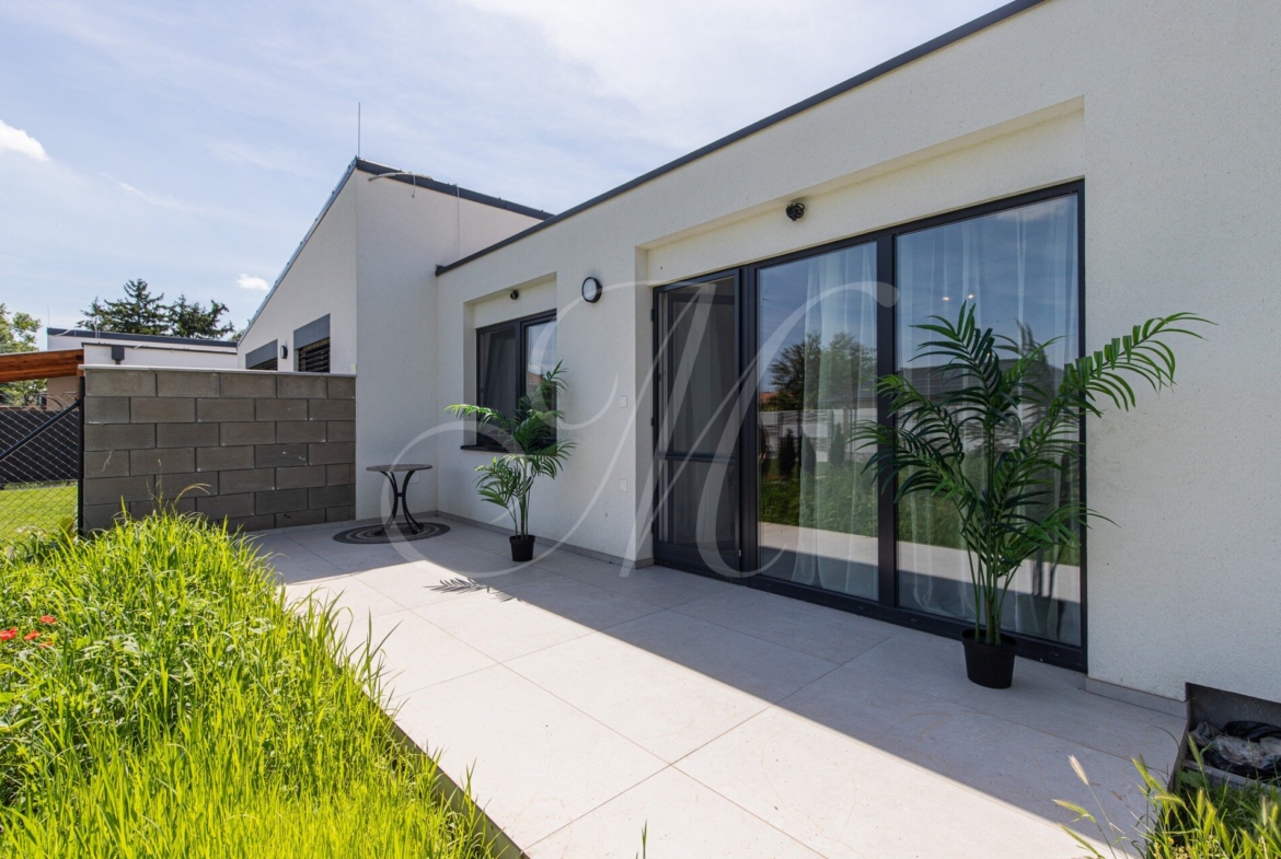 The layout of the family house consists of an entrance hall with space for built-in storage spaces, two separate rooms that can be used as a children’s room / study, a bathroom with a bathtub, shower and toilet, a large bright living room with space for a kitchen and a dining table, and a stylish master bedroom with walk-in wardrobe direction. The living room and the master bedroom face the private plot belonging to the family house with a paved terrace, which can be accessed from the living room.