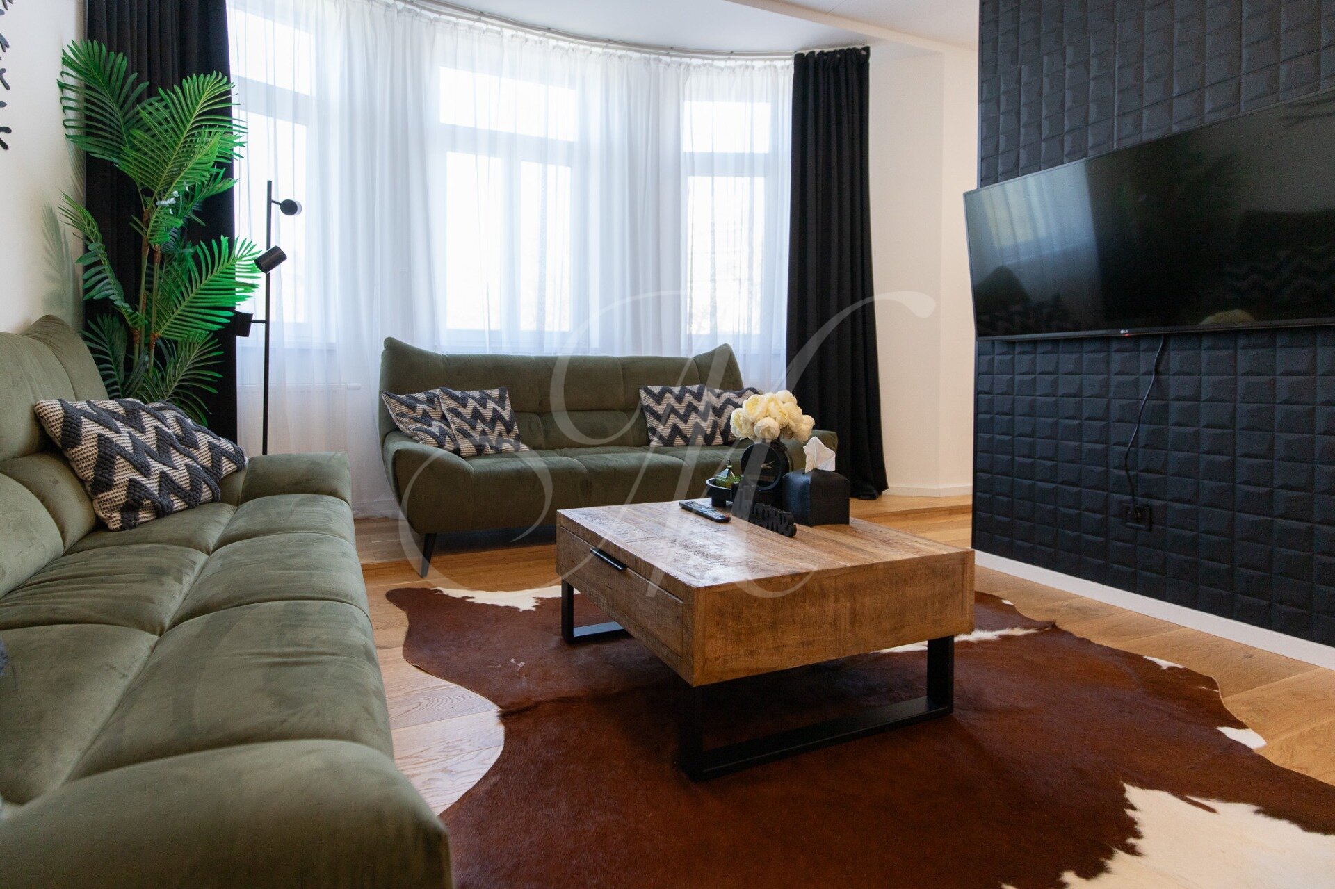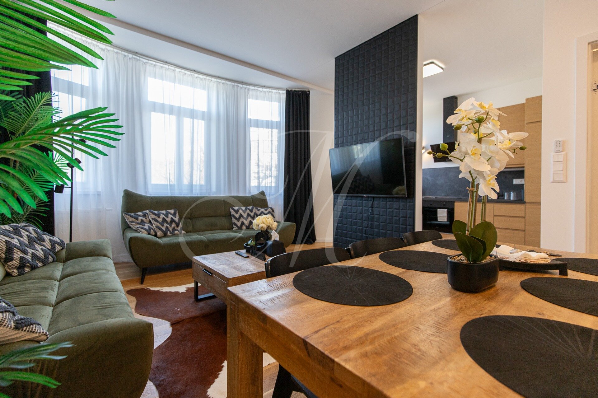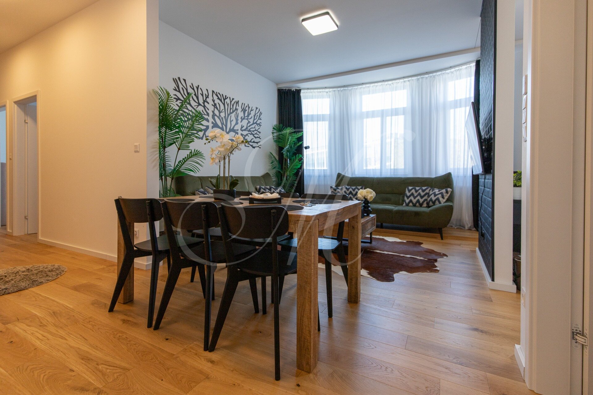 Byt má výmeru 100 m² a nachádza sa na 3. nadzemnom podlaží rezidenčnej vily. Dispozične pozostáva z obývacej izby prepojenej s kuchyňou a jedálenskou časťou, troch samostatných izieb, šatníka, kúpeľne a samostatného WC.