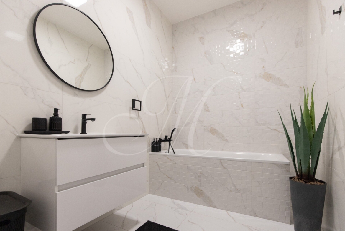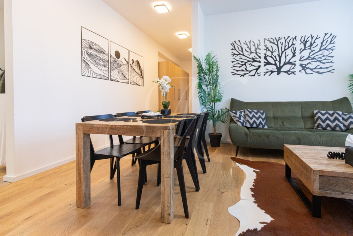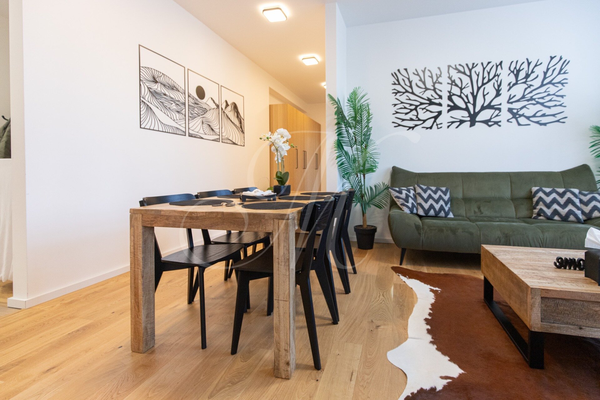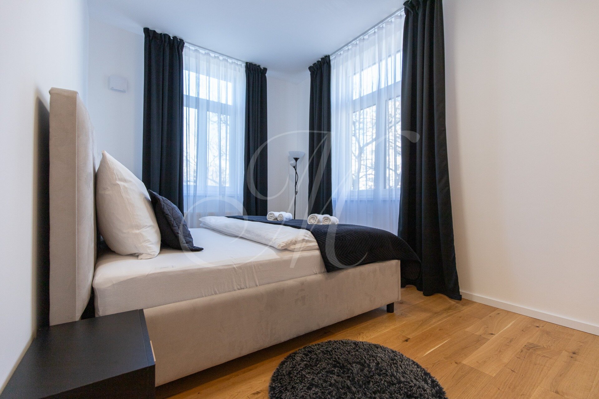 Byt má výmeru 100 m² a nachádza sa na 3. nadzemnom podlaží rezidenčnej vily. Dispozične pozostáva z obývacej izby prepojenej s kuchyňou a jedálenskou časťou, troch samostatných izieb, šatníka, kúpeľne a samostatného WC.
