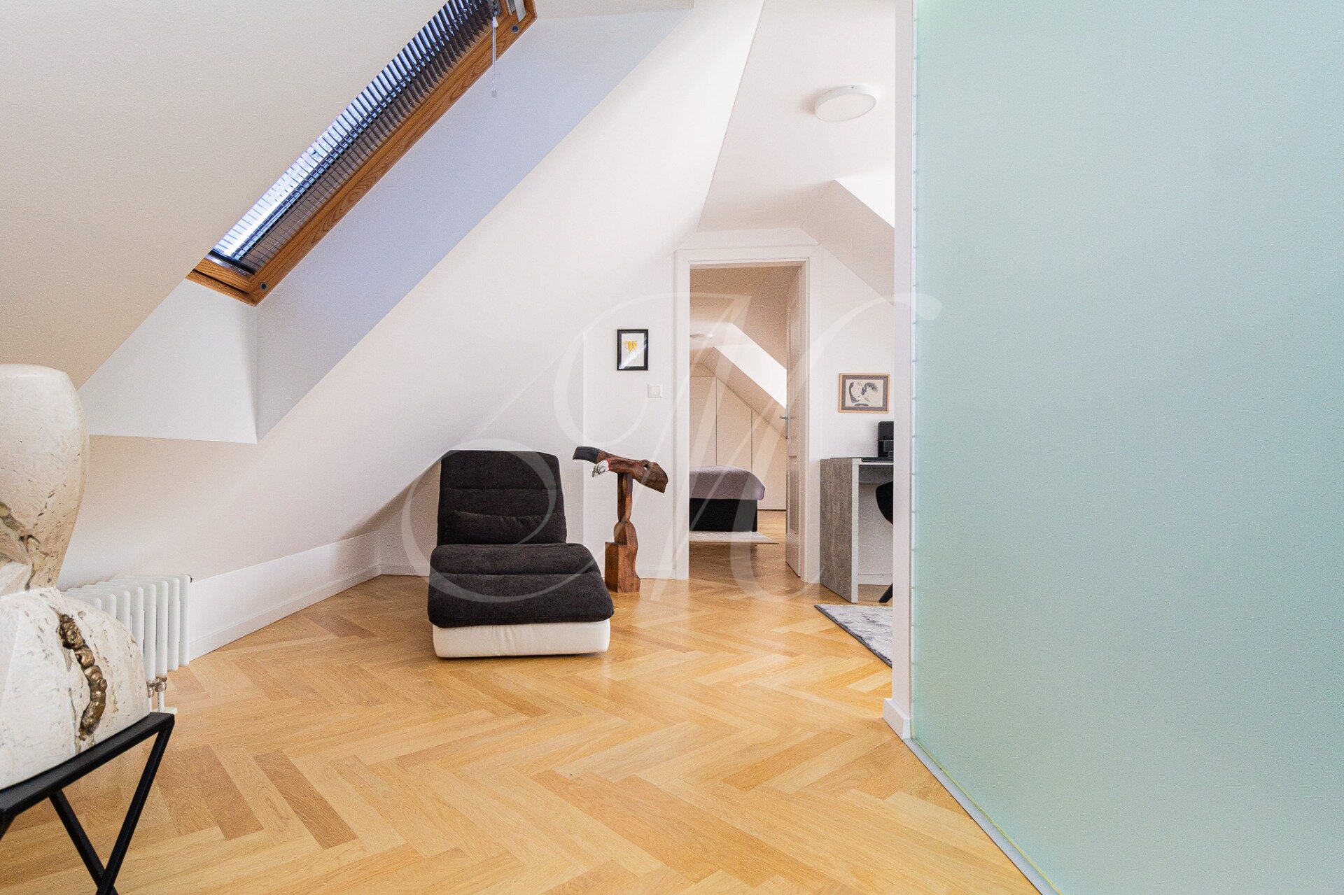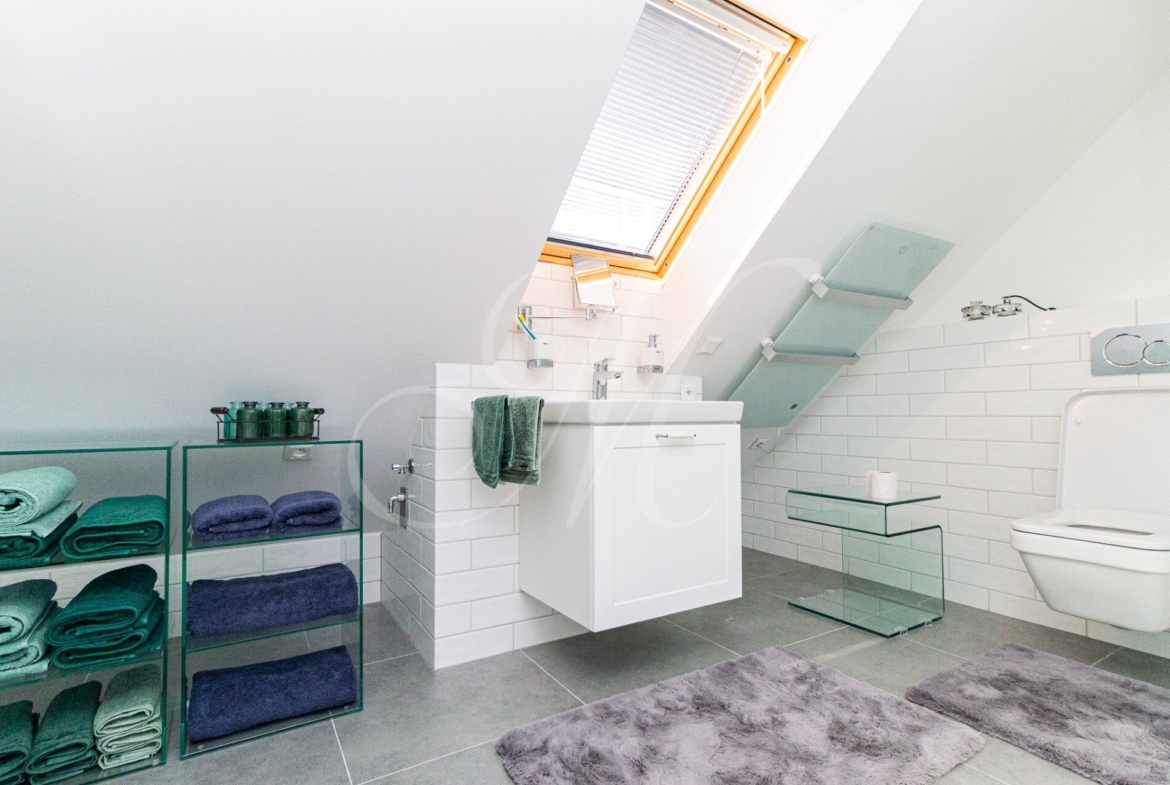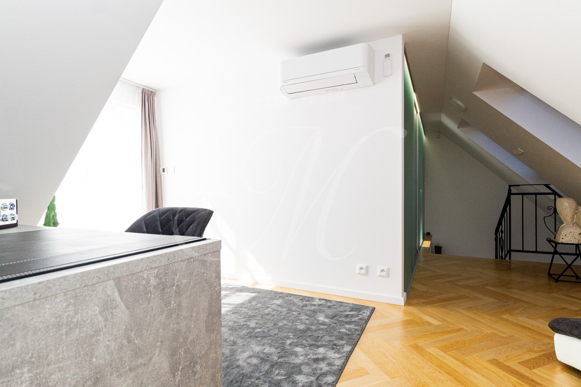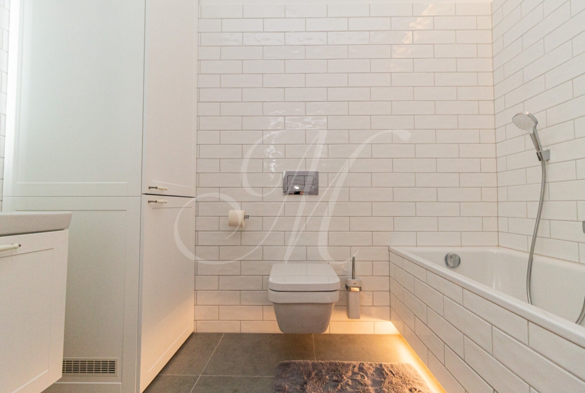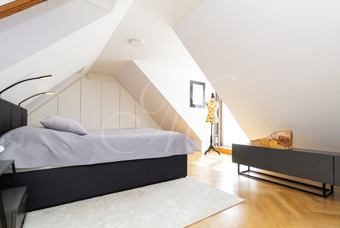 Úplne nový mezonet sa nachádza na 3.poschodí historickej budovy bez výťahu. Dispozícia bytu pozostáva zo vstupnej haly, priestrannej obývačky s televíziou spojenou s kuchyňou so spotrebičmi (chladnička/mraznička, mikrovlnka, umývačka, el.rúra, sporák) a jedálenským nábytkom. Na poschodí sa nachádza pracovňa a manželská spálňa so vstupmi na priestrannú terasu s veľkosťou 40m2. V byte sa nachádzajú dve kúpeľne. Kúpeľňa na spodnom podlaží disponuje vaňou. Na hornom podlaží sa nachádza kúpeľňa so sprchovým kútom.