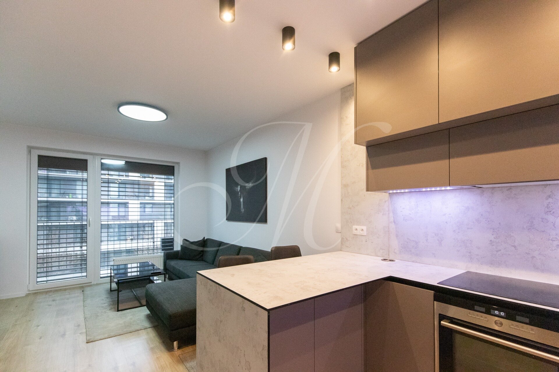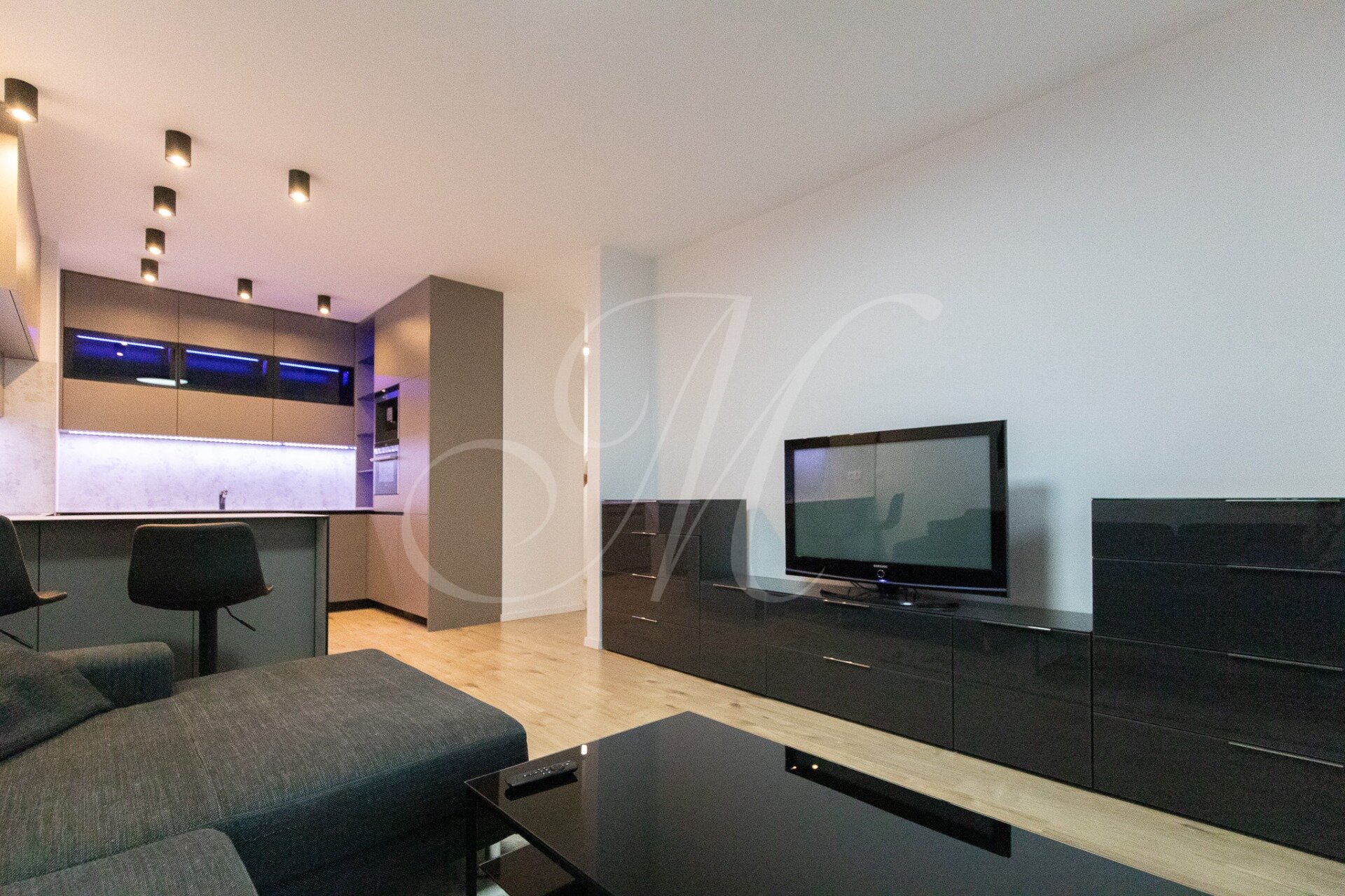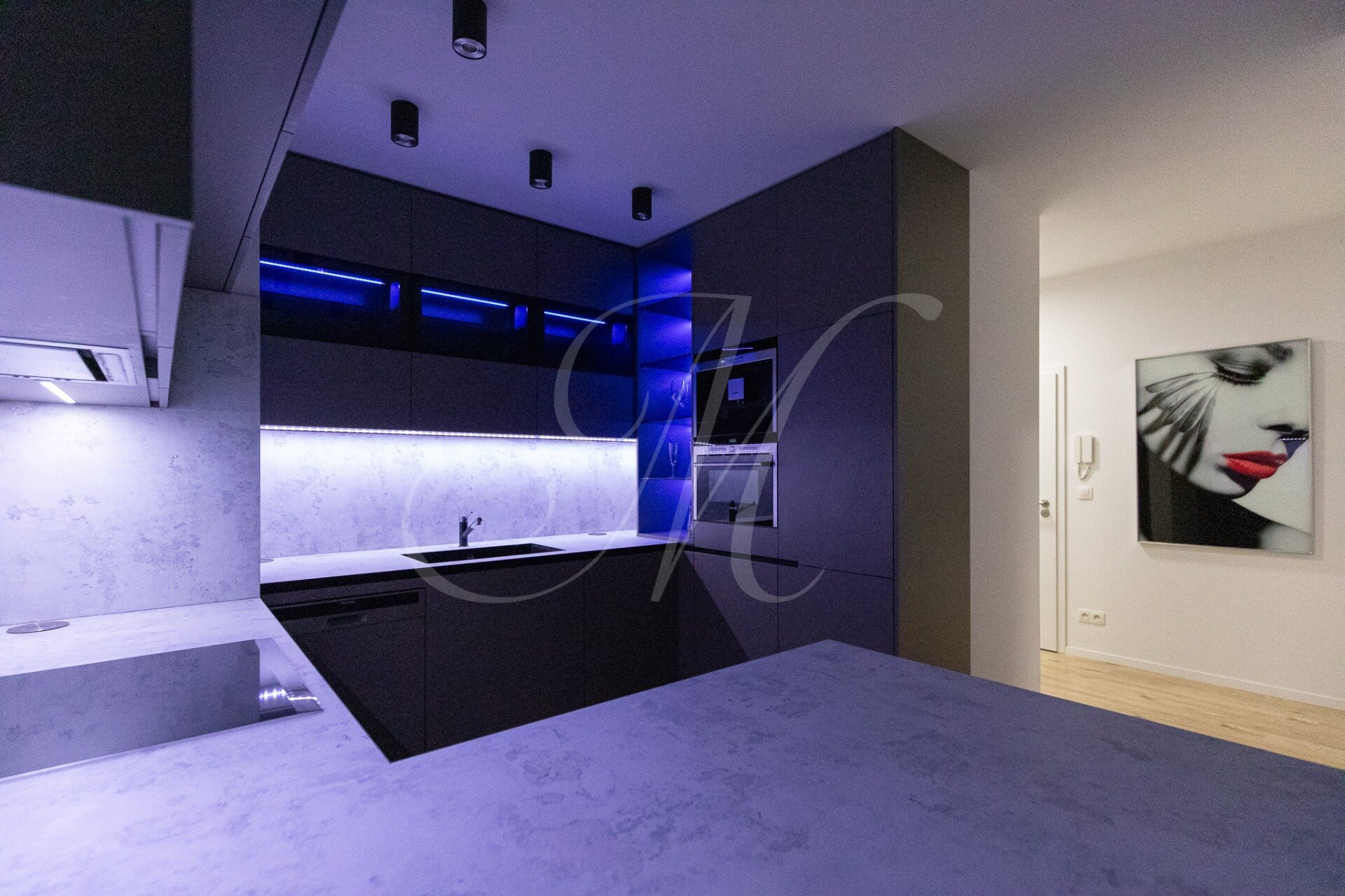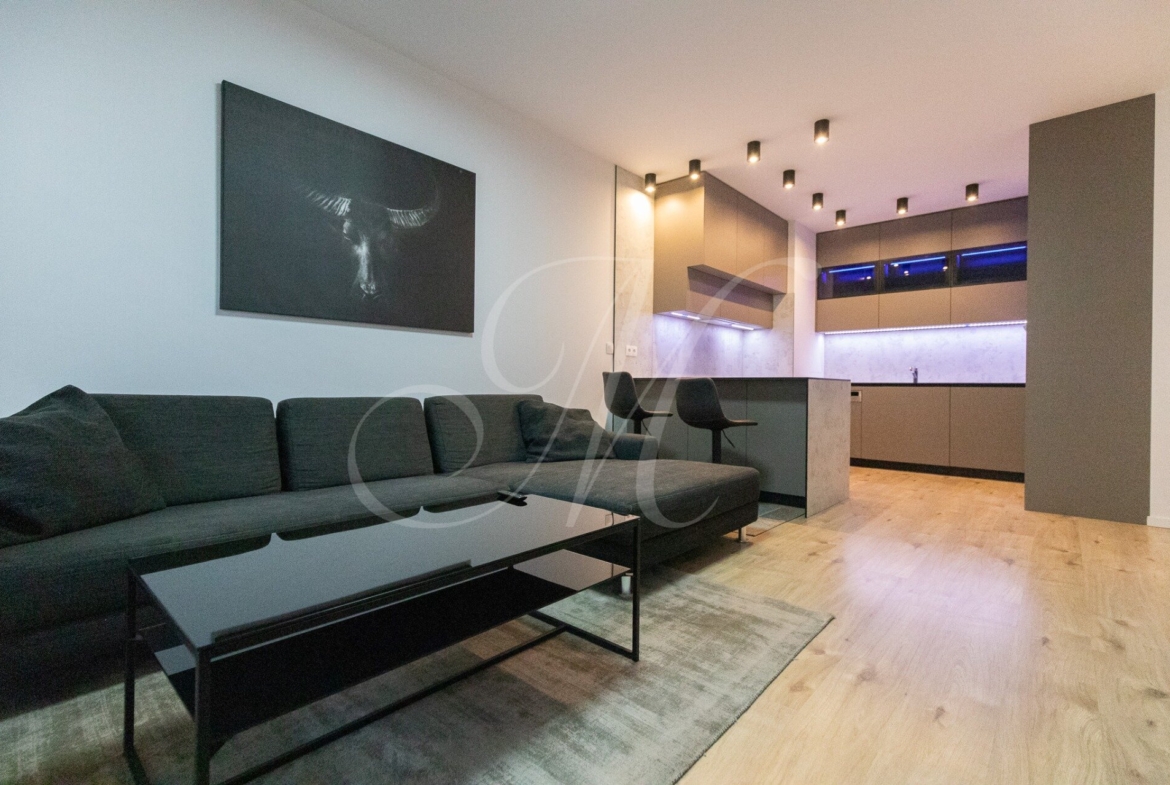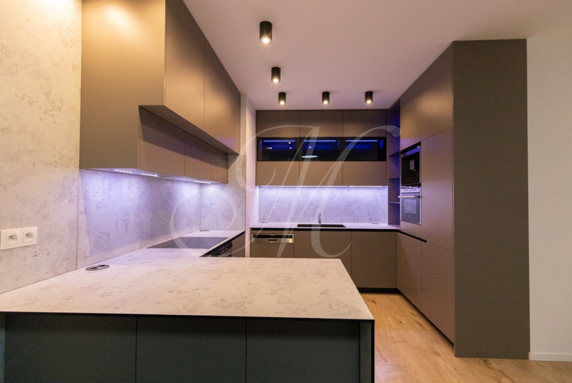 Byt je kompletne zariadený luxusným nábytkom. Kuchyňa ponúka náladové farebné osvetlenie, barový pult a stoličky, a je vybavená značkovými spotrebičmi Siemens: vstavaný kávovar, mikrovlnka, chladnička s mrazničkou, umývačka riadu, rúra, indukčná varná doska a digestor. K dispozícii je práčka so sušičkou LG.
