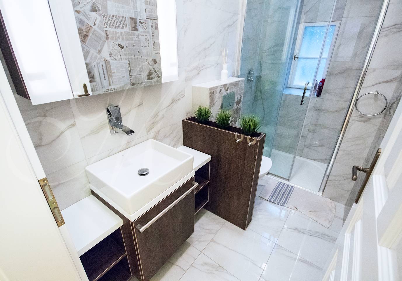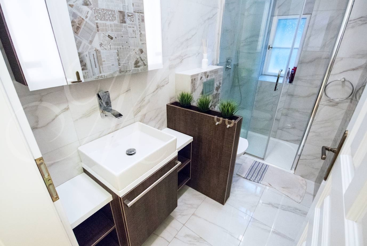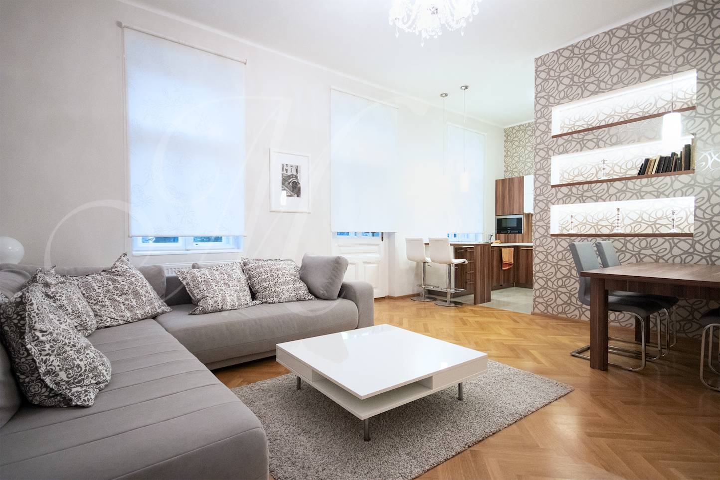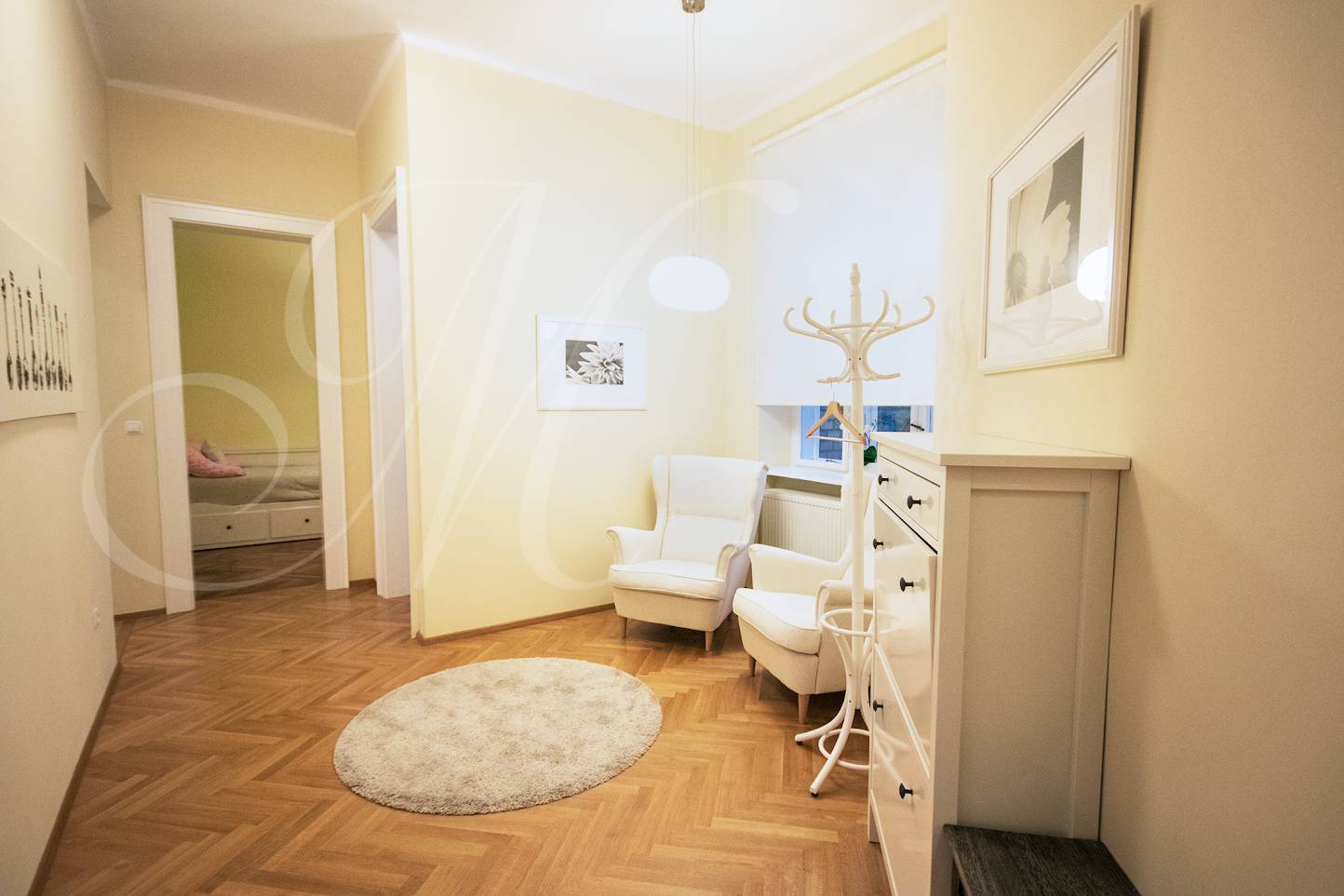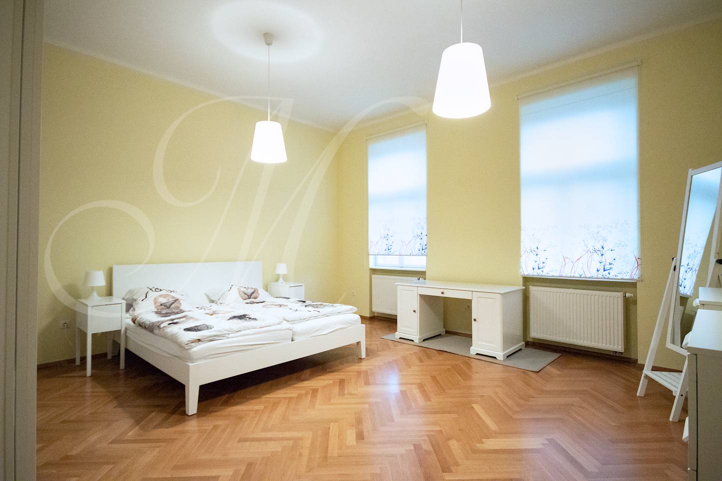 Priestranný 3-izbový byt (120 m2) situovaný na 1.poschodí (3) pozostáva zo vstupnej chodby, obývacej izby prepojenej s plne vybavenou kuchyňou, 2 samostatných spální a 2 kúpeľní (jedna kúpeľňa s vaňou, druhá so sprchovacím kútom a WC). Byt je nadštandardne zariadený, má vysoké stropy, drevené parkety a historický balkón so vstupom z obývacej izby. Je orientovaný do tichšej ulice a do dvora. Byt ponúka vlastnú pivnicu. Je priestranný, veľmi svetlý s vysokými stropmi. Byt má vlastné kúrenie, je kompletne novo zariadený a je vhodný pre náročnejšieho klienta.
