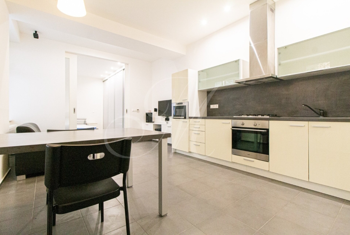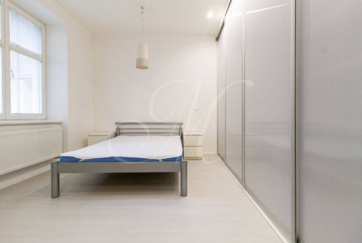 Pekný príjemne zariadený 2 izbový byt (57m2) nachádzajúci sa priamo v centre Starého mesta na zvýšenom prízemí pozostáva zo vstupnej haly, obývacej miestnosti zariadenej sedačkou, TV, kompletne zariadenej kuchyne so spotrebičmi (umývačka riadu, chladnička, mraznička, mikrovlnná rúra, el. rúra, sporák), jedálenského priestoru a slnečnej manželskej spálne vybavenej úložným priestorom a manželskou posteľou. Poslednou časťou bytu je toaleta a kúpeľňa zariadená práčkou.