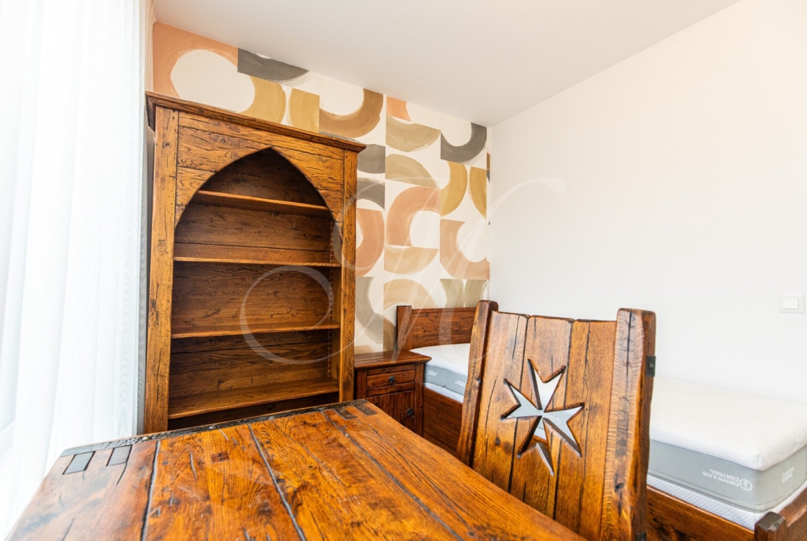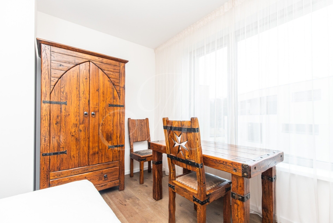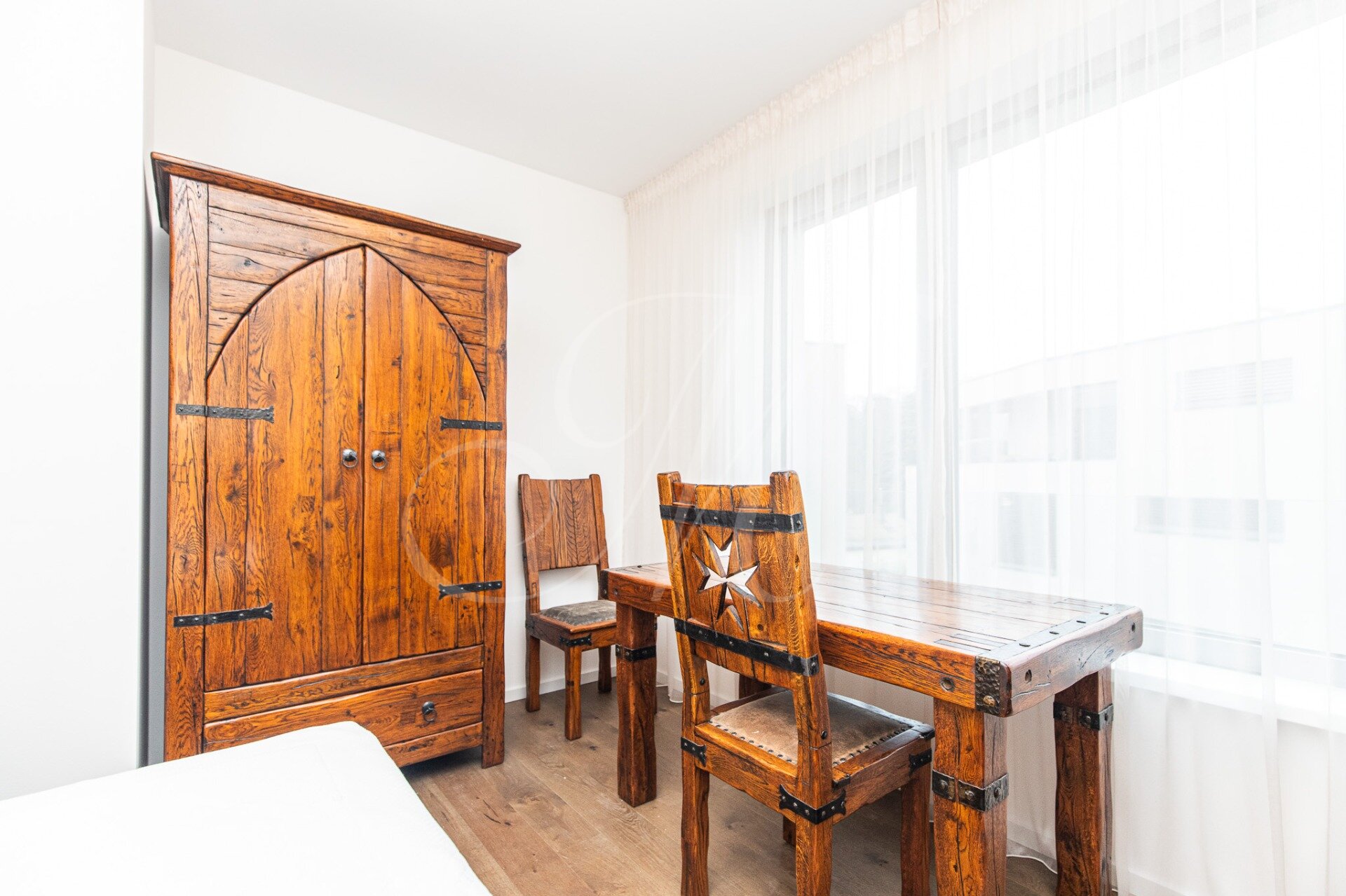 Pozostáva z dizajnovej obývacej miestnosti zariadenej sedačkou, konferenčným stolíkom a TV, jedálenskej časti, modernej kuchyne kuchyne so spotrebičmi (umývačka riadu, chladnička, mraznička, mikrovlnka, el. rúra, sporák), kúpeľne so sprchovým kútom, oddelenej toalety a priestranného balkónu s tichým výhľadom.