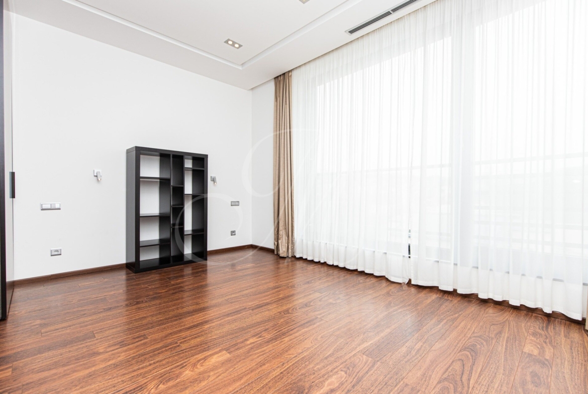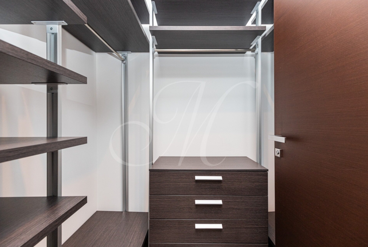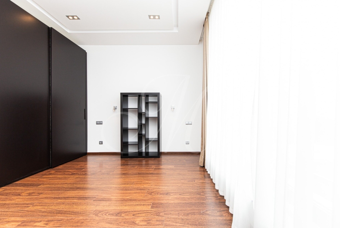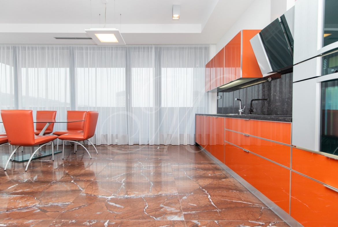 Dispozične je riešený vstupnou halou s úložným priestorom, obývacou miestnosťou s prístupom na priestrannú loggiu, prepojenú s plne vybavenou kuchyňou so spotrebičmi (chladnička, mraznička, el. rúra, sporák, mikrovlnka, umývačka, digestor) a jedálenskej časti, hlavnej spálne, hosťovskej izby, dvoch šatníkov, kúpeľne s práčkou, sušičkou, vaňou, sprchovým kútom. WC a ďalším oddeleným WC.