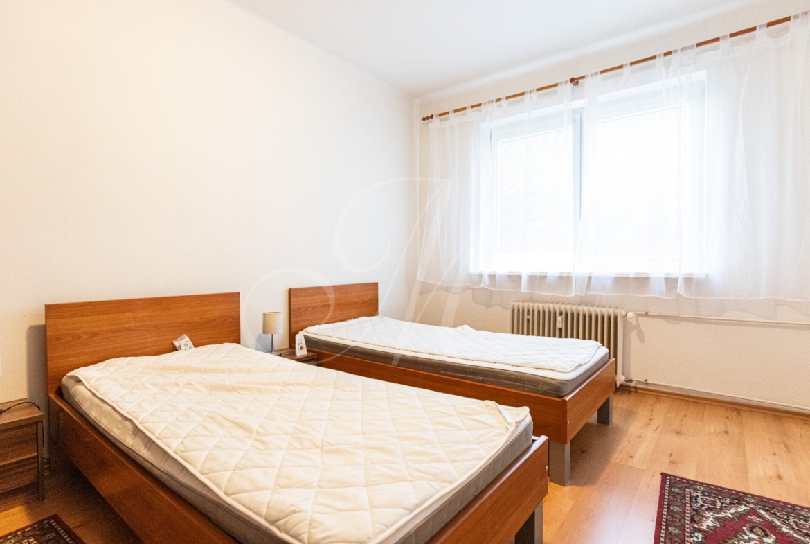 Byt pozostáva zo vstupnej haly, obývacej miestnosti s prístupom na loggiu, samostatnej kuchyne plne vybavenej spotrebičmi (chladnička, mraznička, el. rúra, sporák, digestor) a základnými riadmi, komory, samostatnej izby, kúpeľne s vaňou, práčkou a oddelenej toalety.