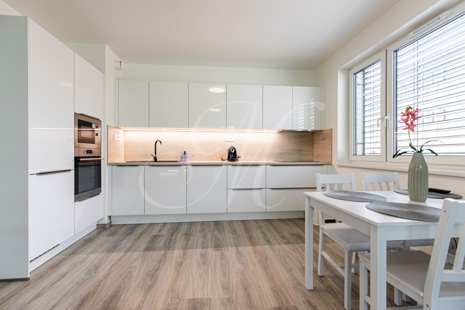 Dispozične je byt riešený vstupnou halou, obývacou miestnosťou prepojenou s plne vybavenou kuchyňou so všetkými spotrebičmi (chladnička, mraznička, el. rúra, sporák, umývačka riadu, digestor) a jedálenskou časťou, samostatnou spálňou s množstvom úložného priestoru, kúpeľňou s vaňou, práčkou a WC. Prístup na terasu je možný zo spálne a obývacej miestnosti.