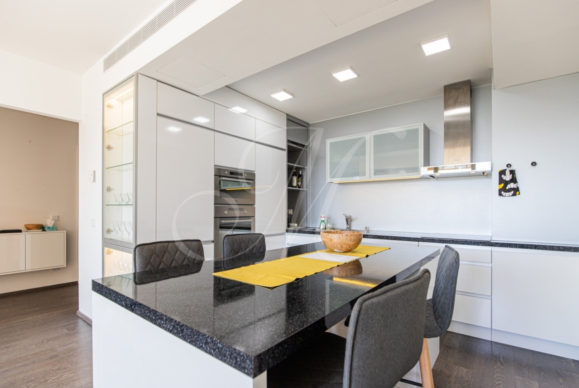 Byt je klimatizovaný a prislúcha k nemu terasa s výhľadom na mesto (15 m2) a pivničná kobka (5 m2).