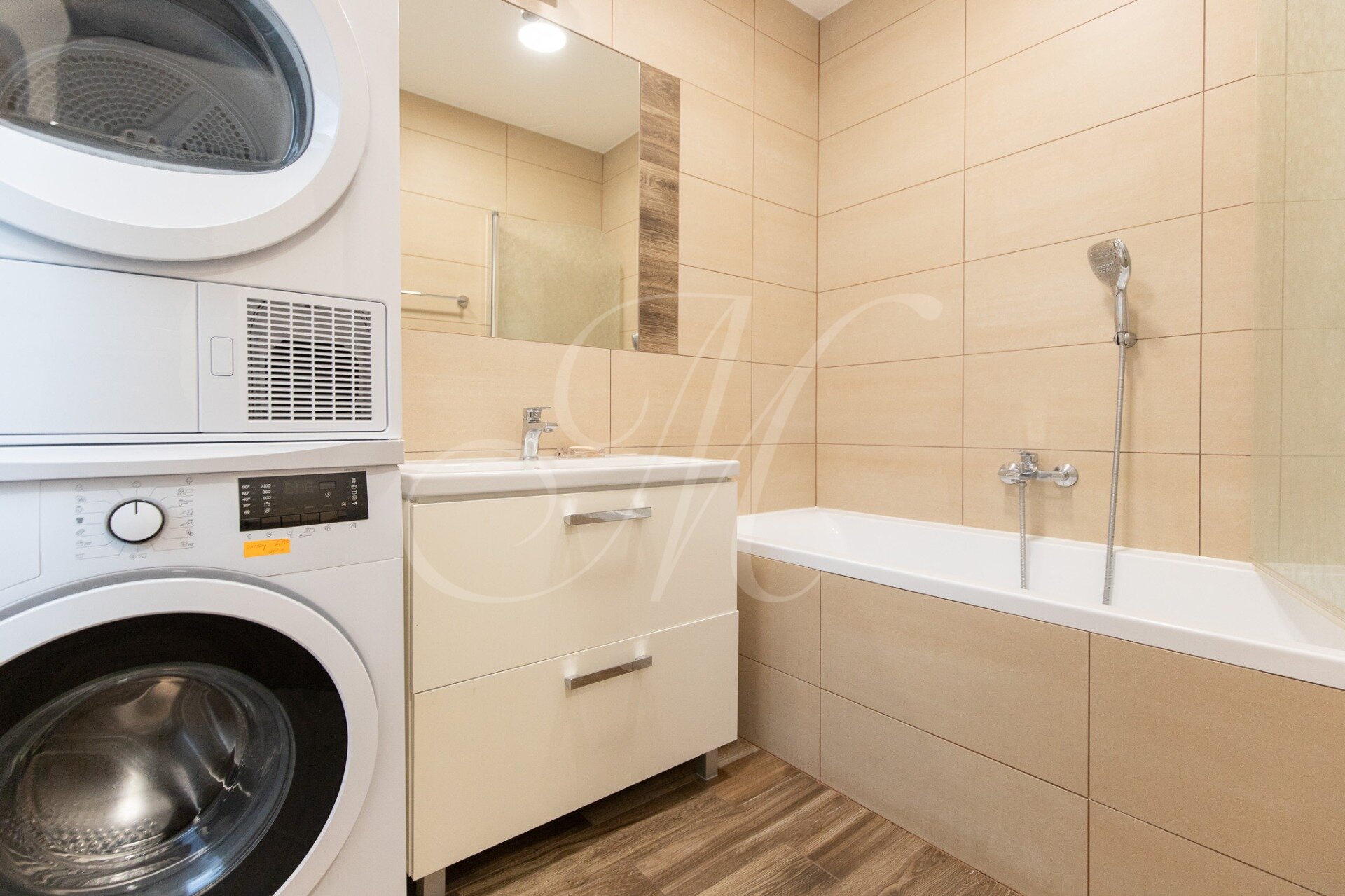 Byt sa prenajíma zariadený, väčšina nábytku je vyrobená na mieru. Súčasťou vybavenia je klimatizácia, práčka, sušička, umývačka riadu a optický internet.
