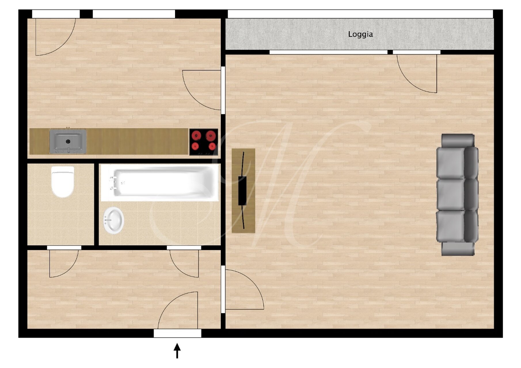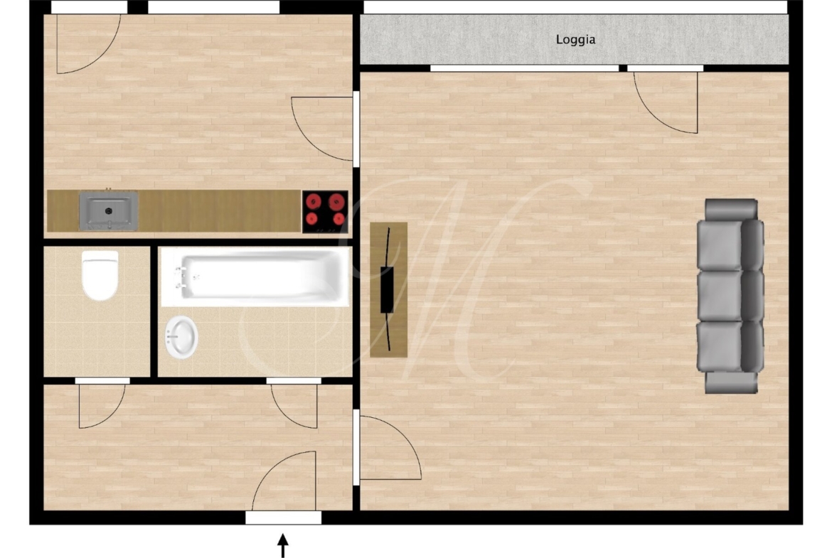Vstup do bytu je cez vstupnú halu s úložným priestorom. Pri vstupnej hale sa nachádza oddelená toaleta a kúpeľňa s vaňou v pôvodnom stave. Zvyšnú časť bytu tvorí obývacia miestnosť s prístupom na zasklenú lodžiu a samostatná kuchyňa s malou komorou. Byt je možné prerobiť na 1,5 izbový byt pomocou drobnej rekonštrukcie.
