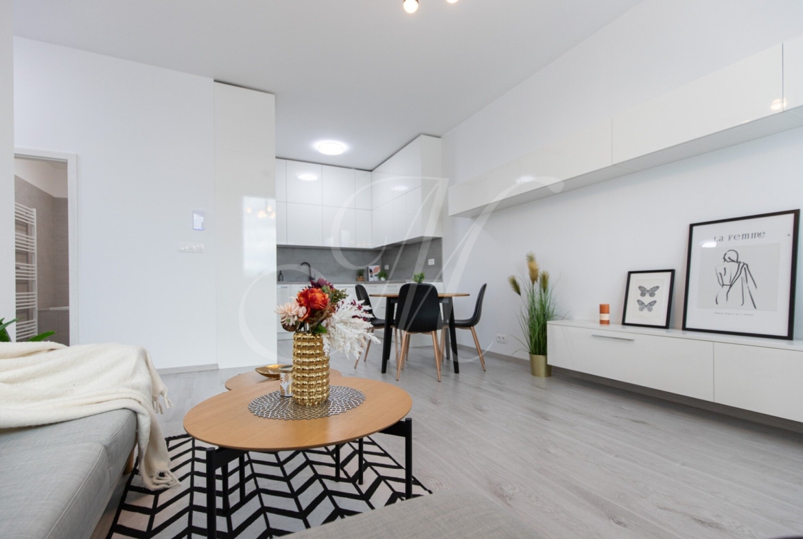 Dispozične pozostáva z predsiene, obývacej miestnosti prepojenej s kompletne zariadenou kuchyňou, spálne, kúpeľne a samostatného WC. Byt disponuje aj balkónom (2,5m2). K dispozícii k prenájmu je aj parkovacie státie v podzemnej garáži, ako aj pivničná kobka 4,2m2.
